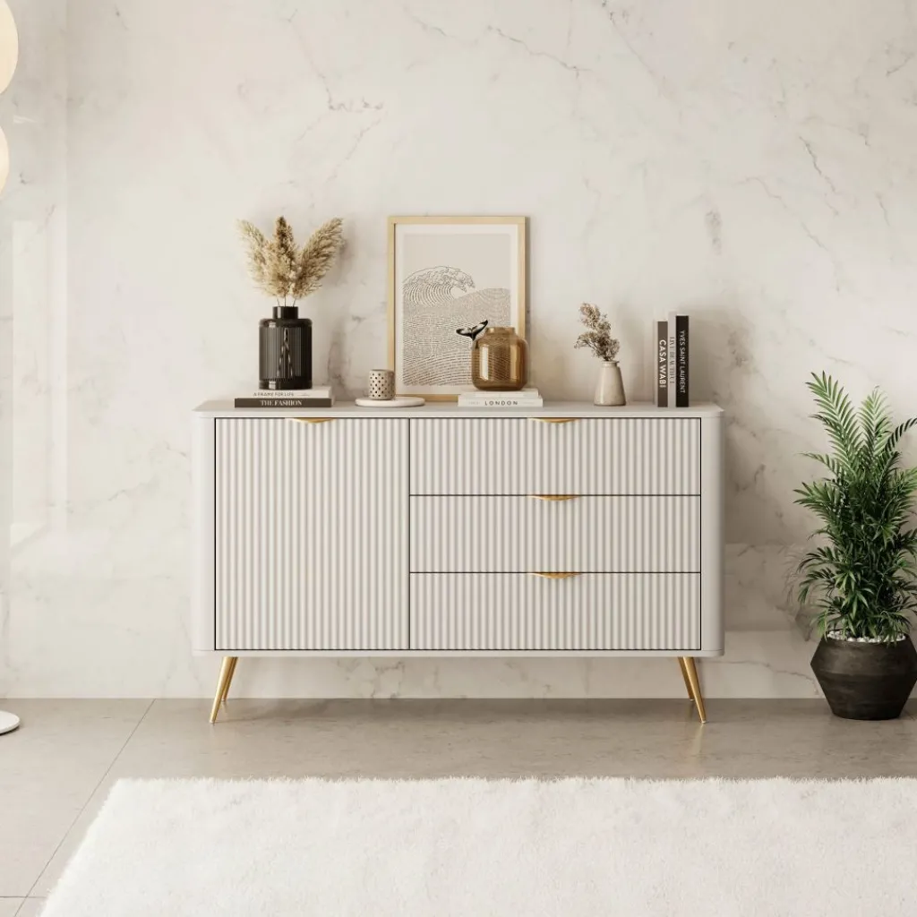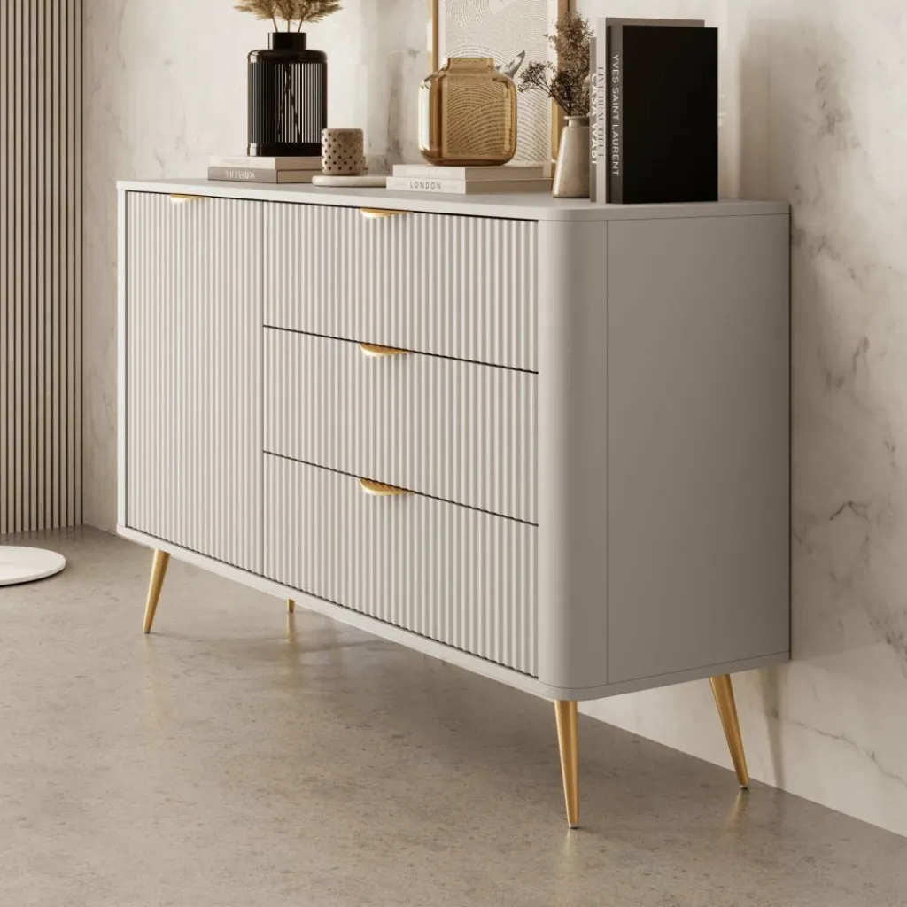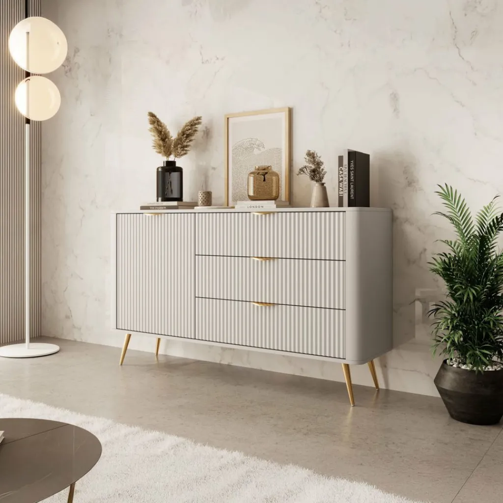 Dressoir Lima is een opbergkast in een hotel chique stijl. Het dressoir staat op metalen poten in de kleur goud. De kast heeft 3 lades en 1 deur die openen met goudkleurige handgrepen. Achter het deurtje bevinden zich 2 opbergvakken. De voorkant heeft een latten patroon wat de kast een unieke uitstraling geeft.