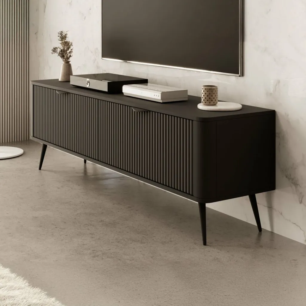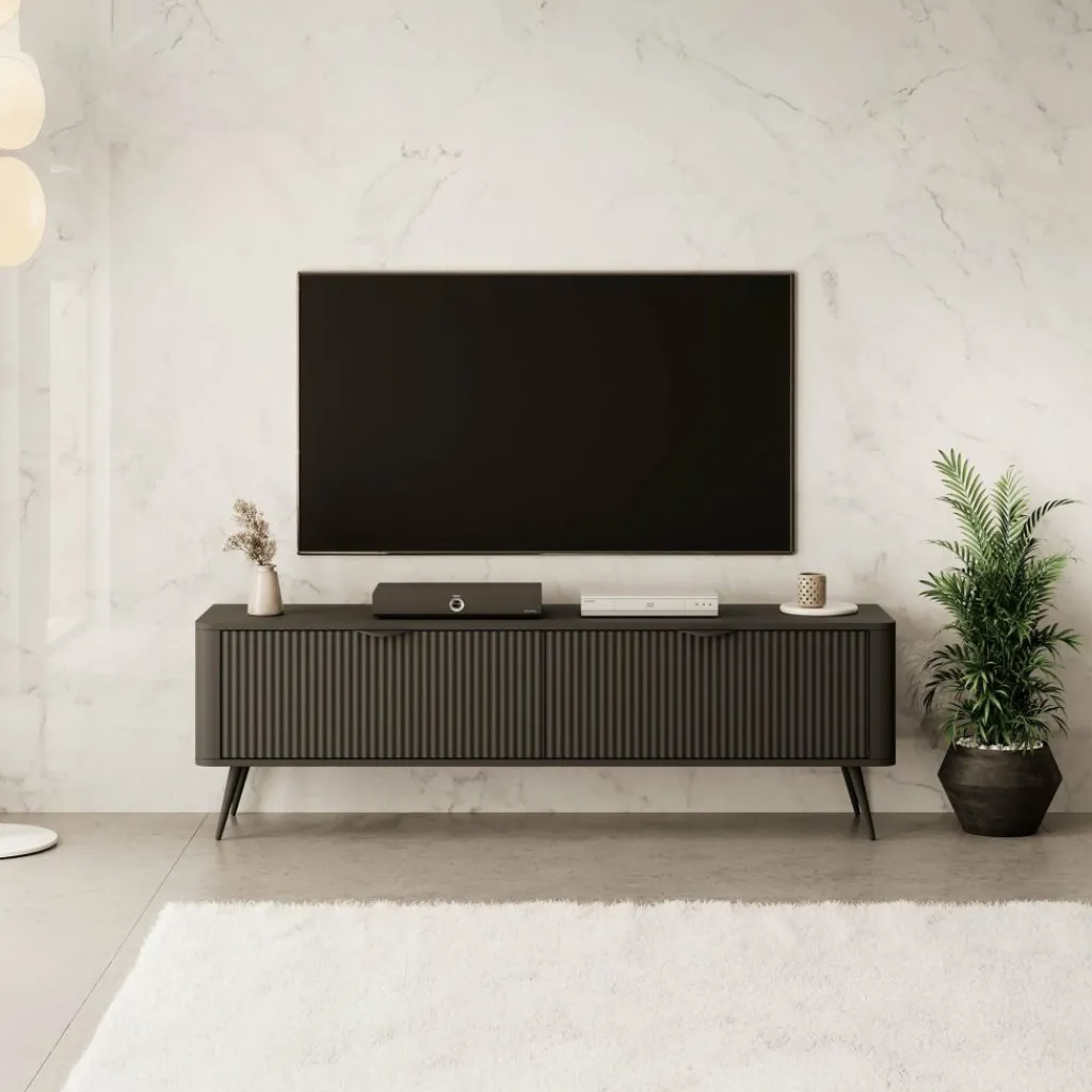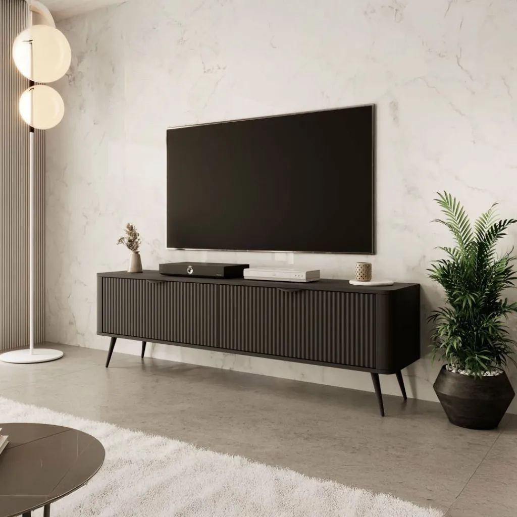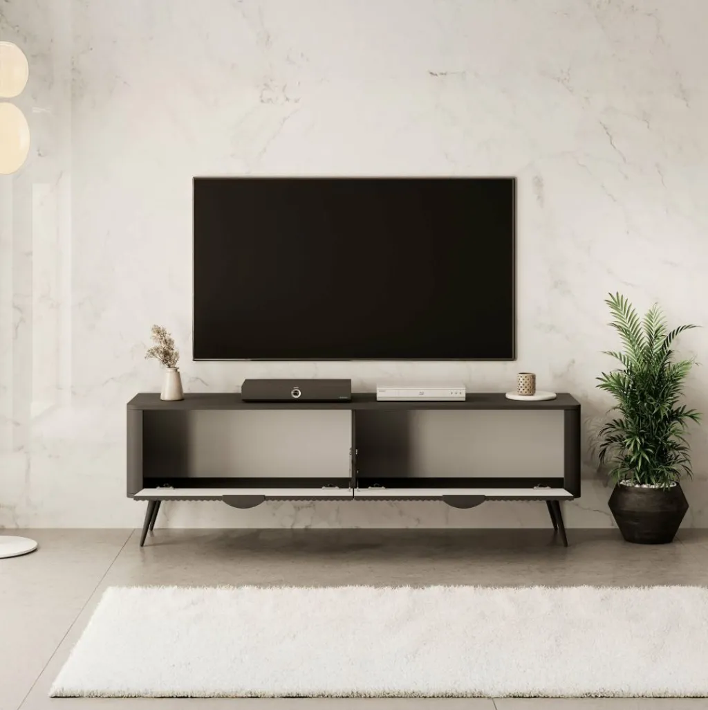 TV-Meubel Lima beschikt over 2 kleppen met daarachter grote opbergvakken. Deze deuren zijn te openen met zwarte handgrepen. Er zit geen uitsparing in de achterwand om eventuele bedrading weg te kunnen werken. De voorkant van de kast heeft een latten patroon.