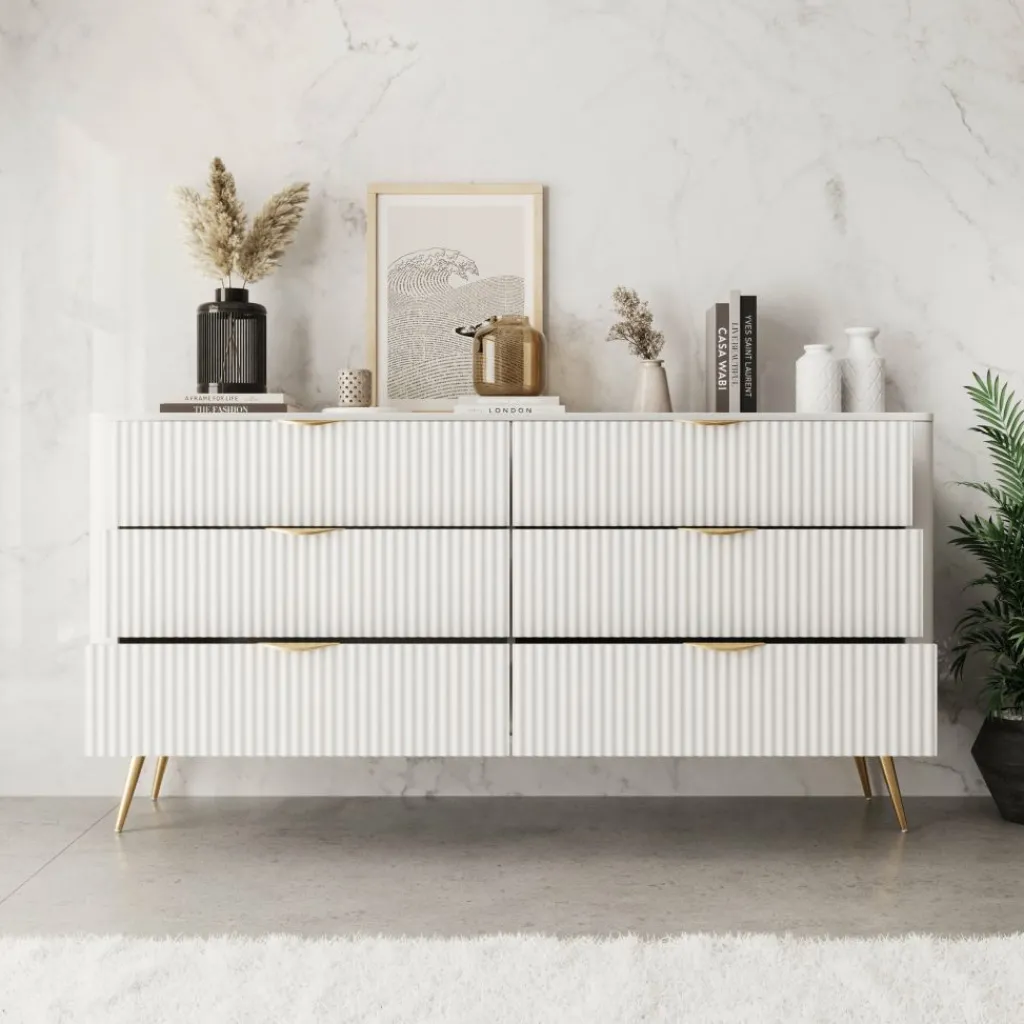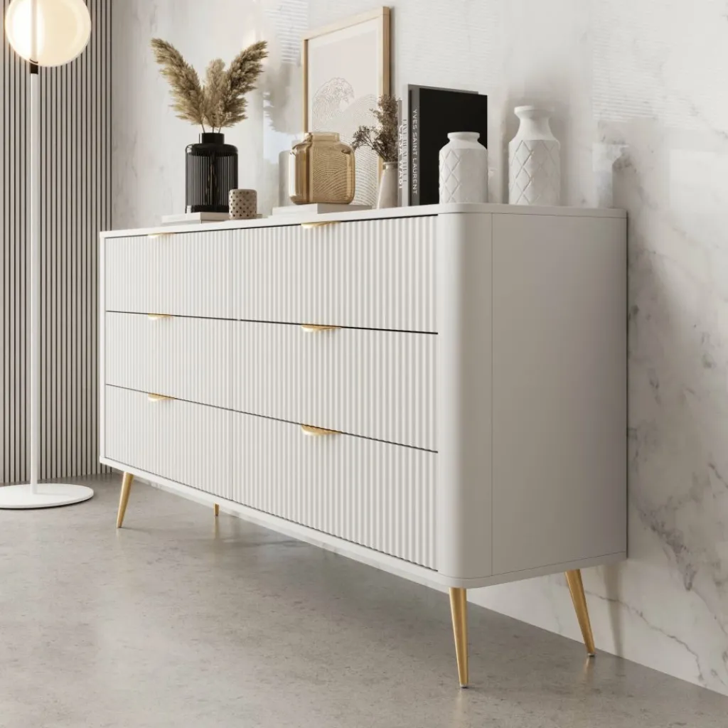 De Lima ladekast in wit heeft een strak en modern ontwerp met subtiele, elegante details. De verticale lijnen in het front, afgeronde hoeken en goudkleurige grepen en poten geven het meubel een luxe uitstraling zonder overdreven te zijn.