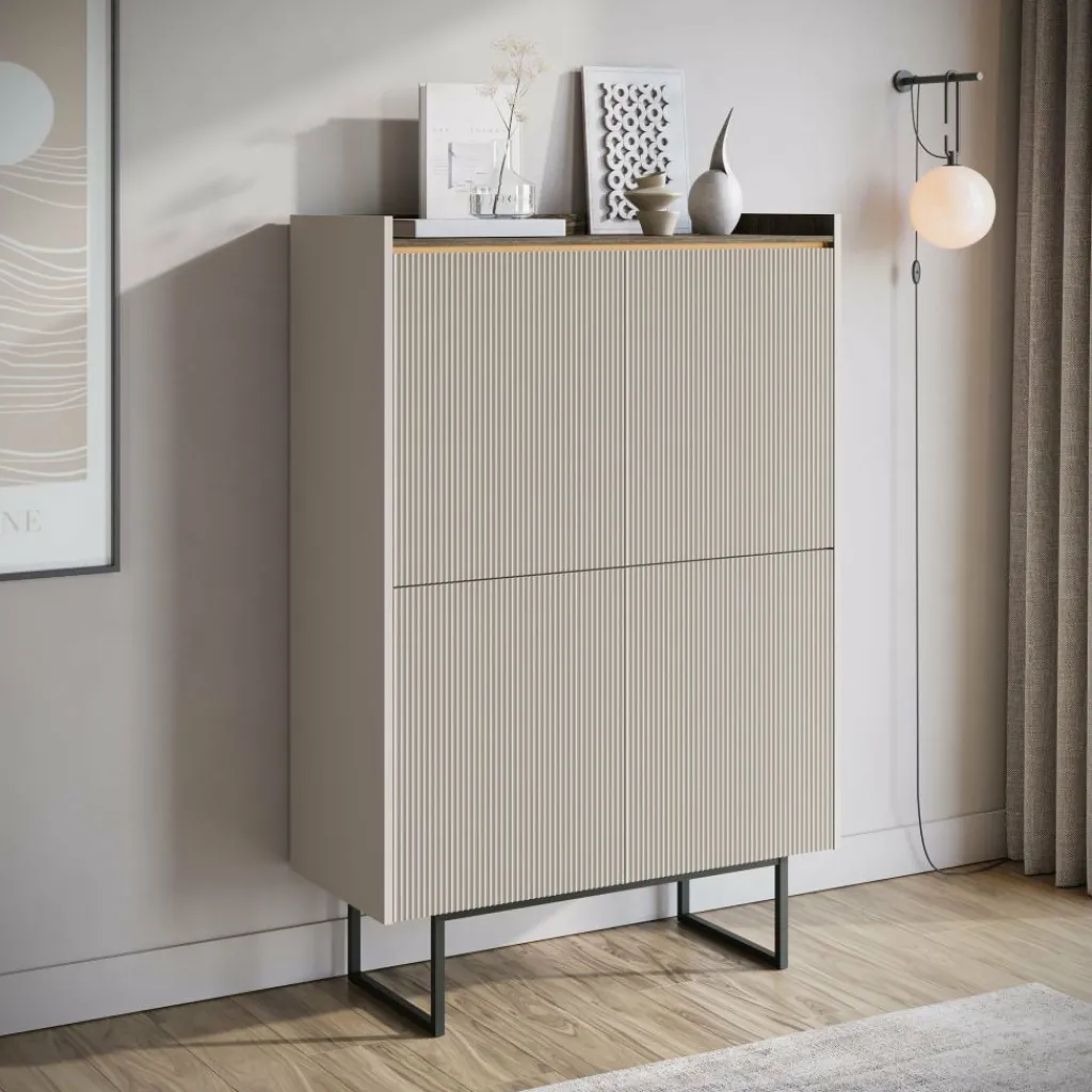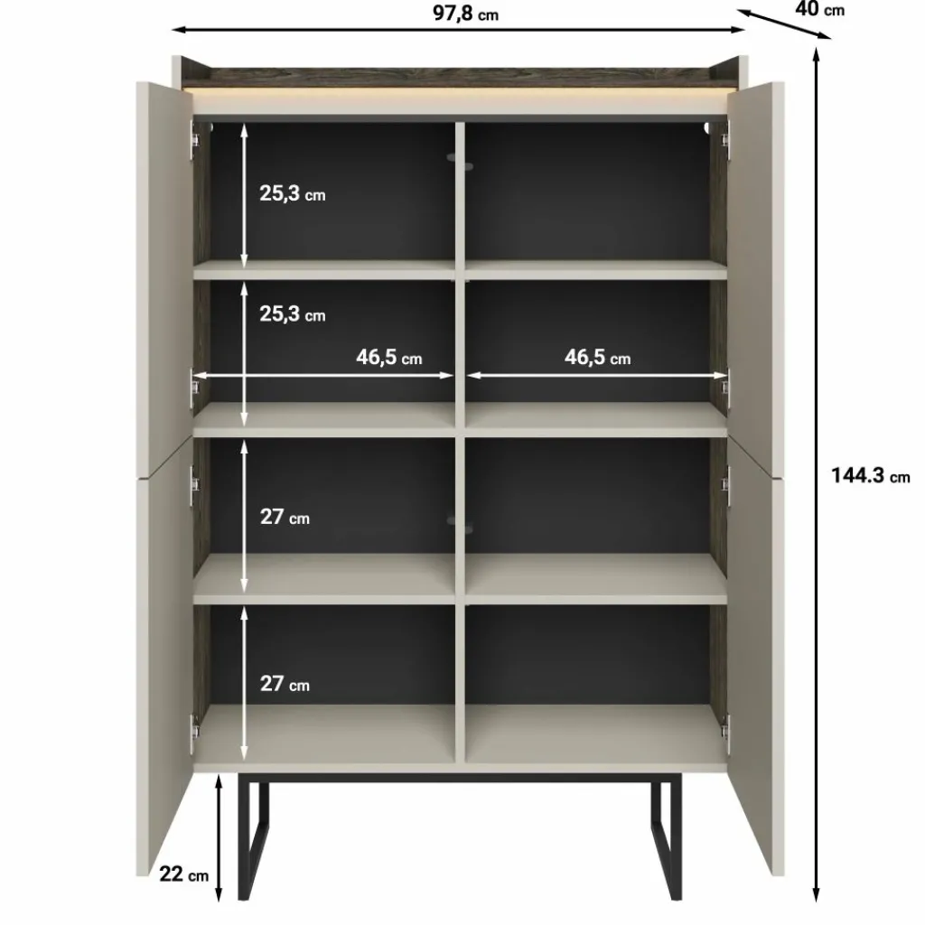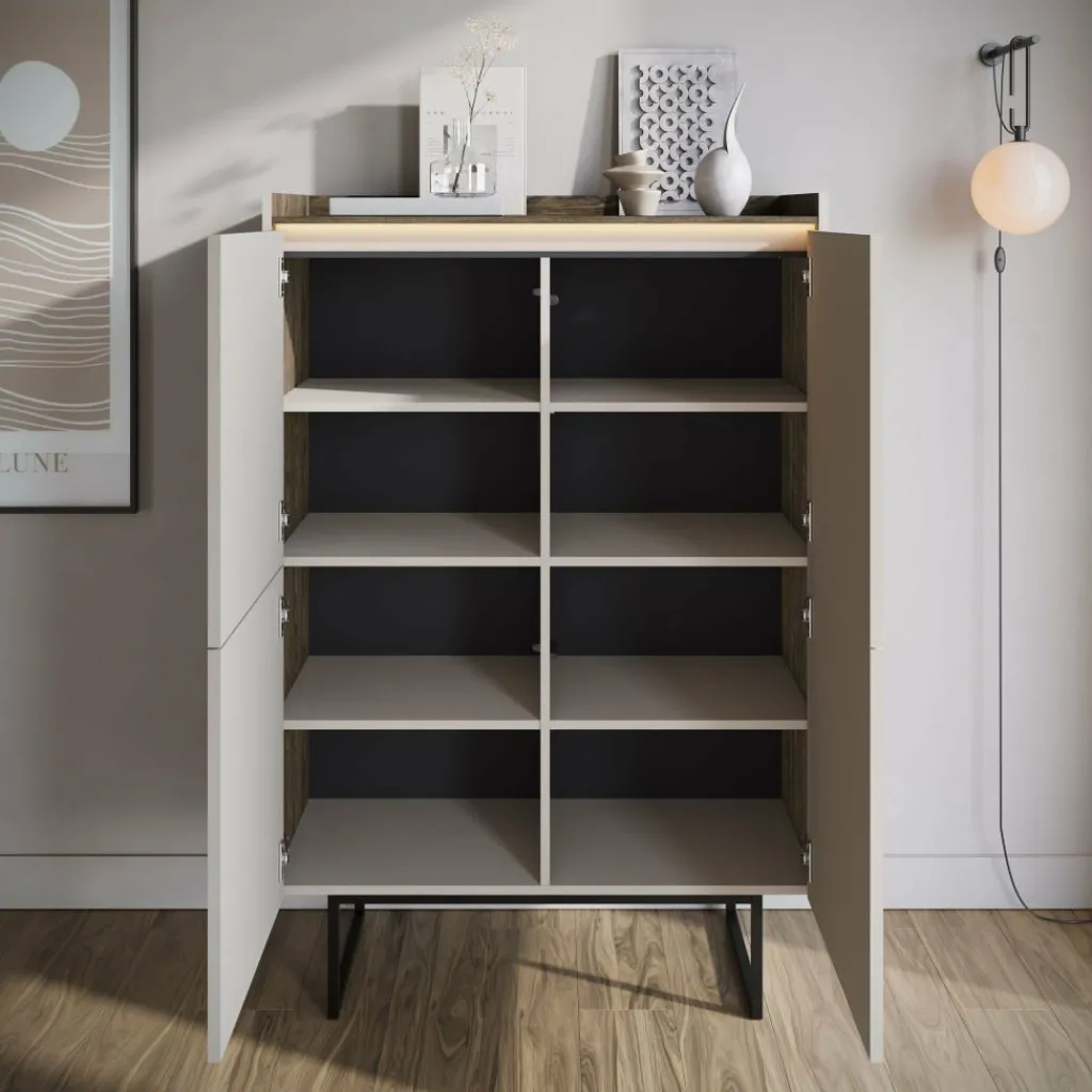 Dressoir Linq is een opbergkast in een moderne stijl. De kast beschikt over 4 deuren die openen met het push to open systeem. Hierachter zitten 8 opbergvakken. De voorkant van deze deuren hebben een latten patroon. Aan de bovenkant is LED-verlichting geplaatst. De Linq staat op metalen pootjes in de kleur zwart. Verder is het meubel uitgevoerd in een beige kleur met donker eiken bovenblad.