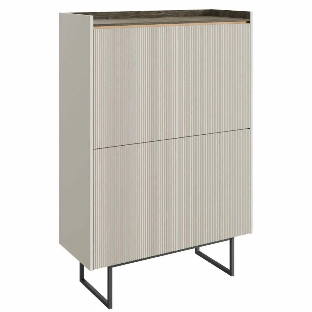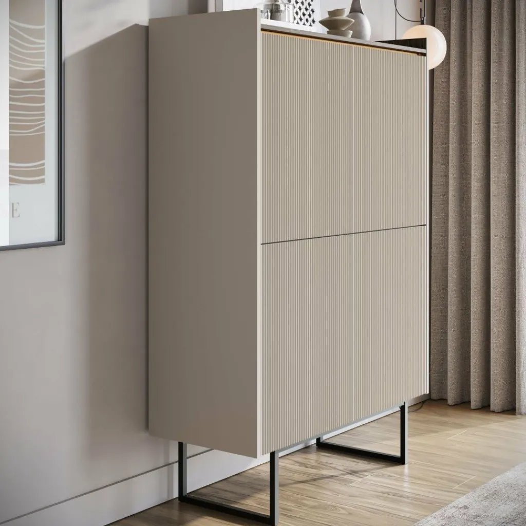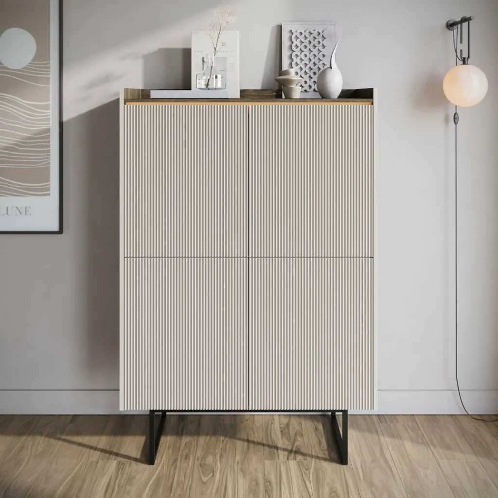 Dressoir Linq is een opbergkast in een moderne stijl. De kast beschikt over 4 deuren die openen met het push to open systeem. Hierachter zitten 8 opbergvakken. De voorkant van deze deuren hebben een latten patroon. Aan de bovenkant is LED-verlichting geplaatst. De Linq staat op metalen pootjes in de kleur zwart. Verder is het meubel uitgevoerd in een beige kleur met donker eiken bovenblad.
