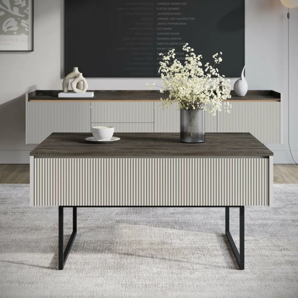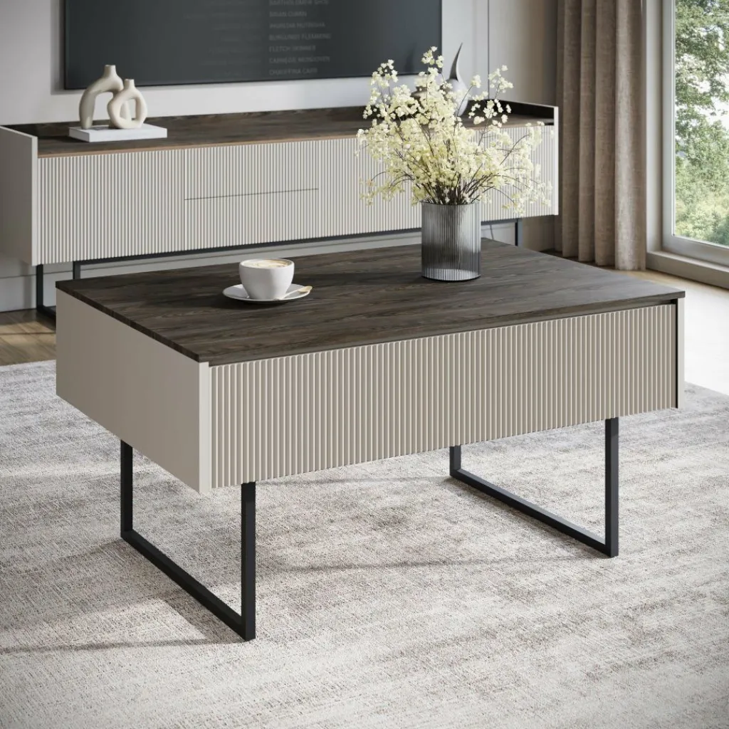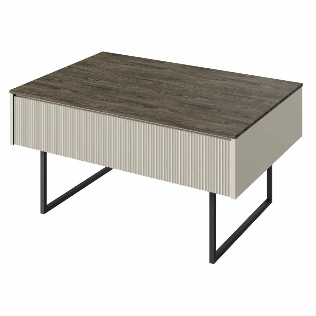 Salontafel Linq is een salontafel met een moderne uitstraling. De tafel beschikt over een klep onder het blad. Deze is greeploos en te openen met het push to open systeem. Op de voorkant van de klep zit een lattenpatroon. Aan de andere kant zit nog een open vak. De salontafel is uitgevoerd in een beige kleur met donker eiken blad. Het onderstel is in de kleur zwart en gemaakt van metaal.