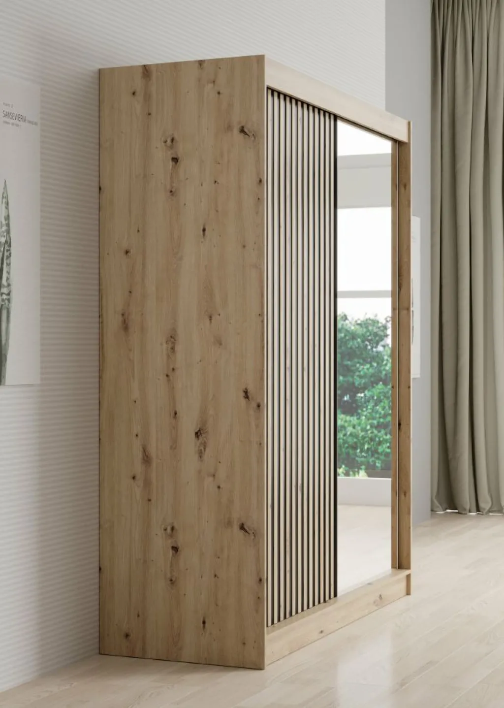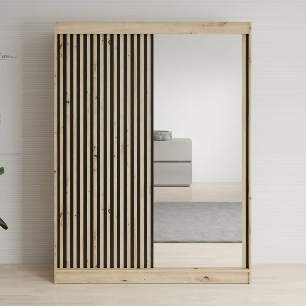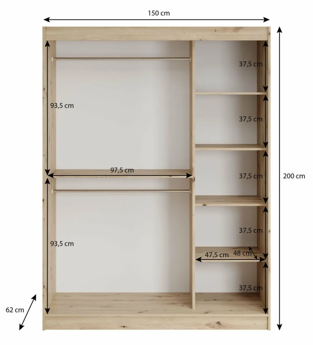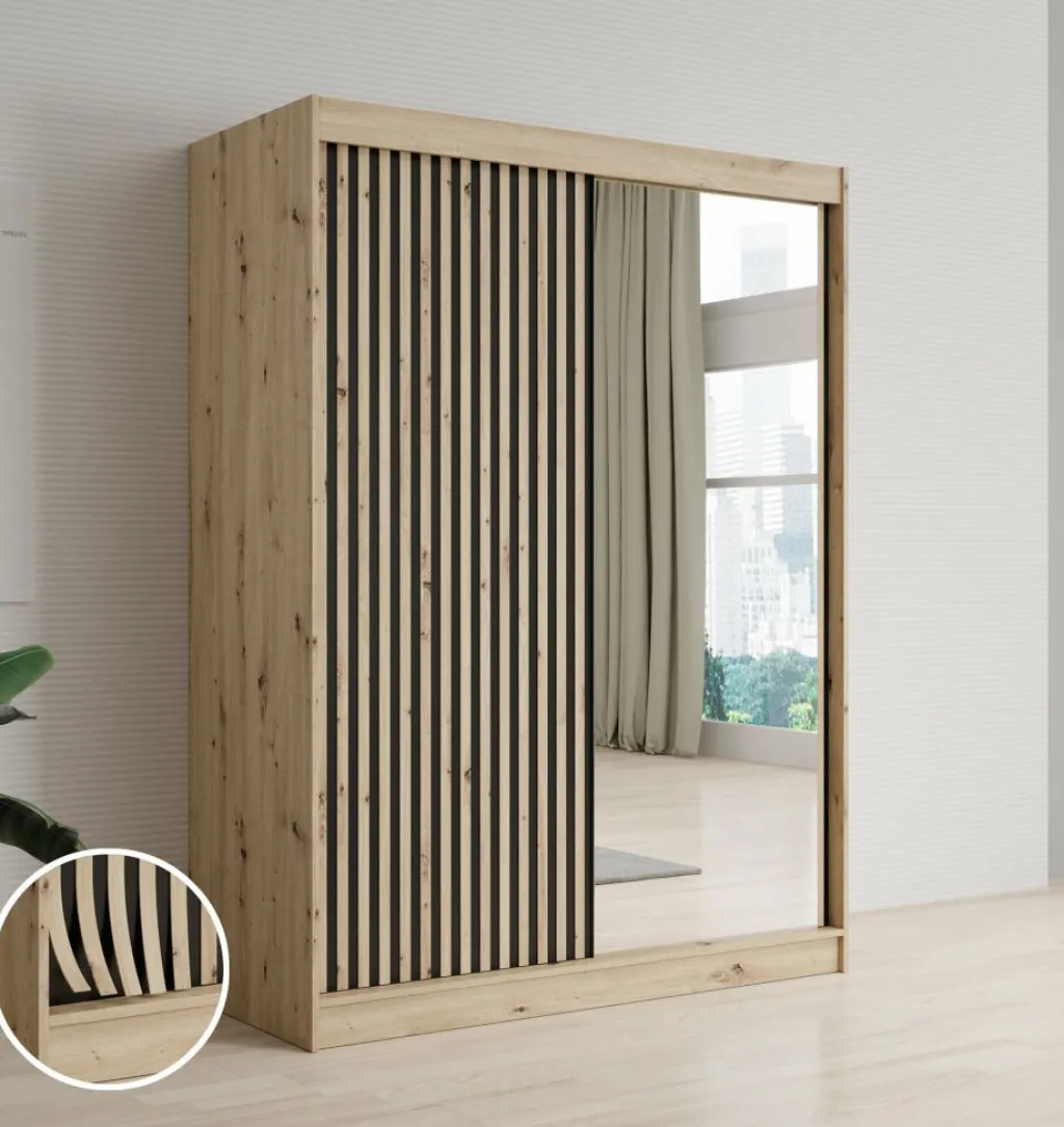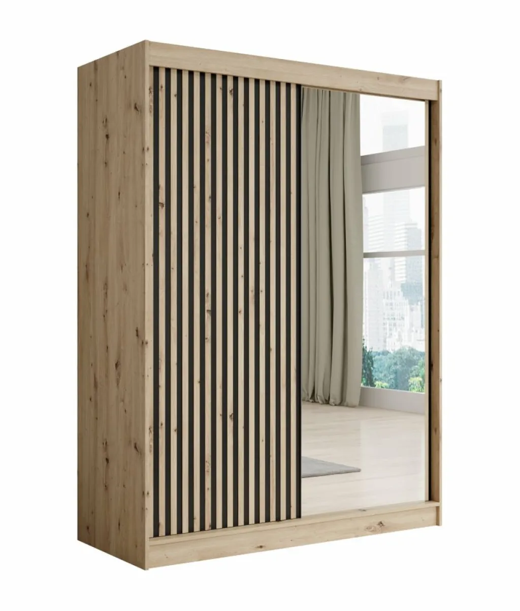 Kledingkast Lisbon is een garderobekast met ruime opbergmogelijkheden. Dit model is voorzien van 2 schuifdeuren, met op de rechterdeur een grote spiegel. Het binnenwerk bestaat uit 5 open schappen. Aan de linkerzijde van de kast is er een mogelijkheid om kleding op te hangen op de daarvoor bestemde kledingstangen. Dit model is afgewerkt in eiken kleur met mat zwarte details.