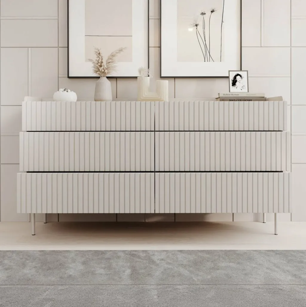 Ladekast Livako is een beige opbergkast in een moderne stijl. Het bovenblad is gemaakt in een eiken kleur. De kast beschikt over 6 lades die openen met het push to open systeem. De voorkant heeft een latten patroon wat de kast een unieke uitstraling geeft. Het dressoir staat op metalen poten.