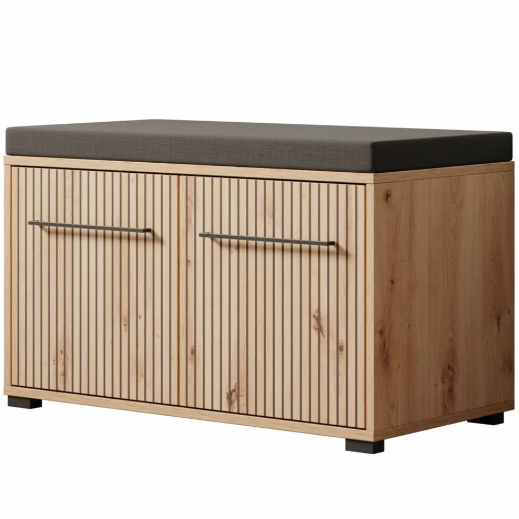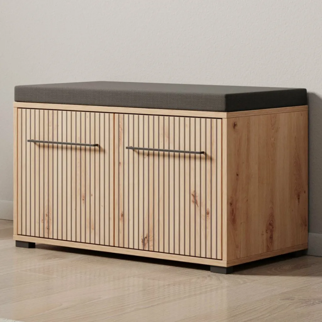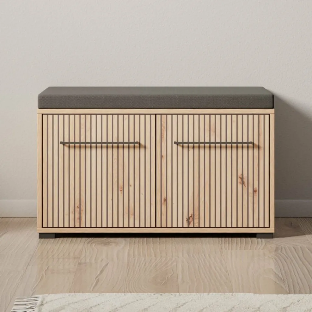 Schoenenkast Lobos is een modern meubel in de kleur eiken, welke is geschikt voor het opbergen van je schoenen. Het kastje is voorzien van 2 deuren die te openen zijn met een zwarte handgreep. Hierachter zitten in totaal 2 opbergvakken. Het meubel heeft een kussentje op het bovenblad.