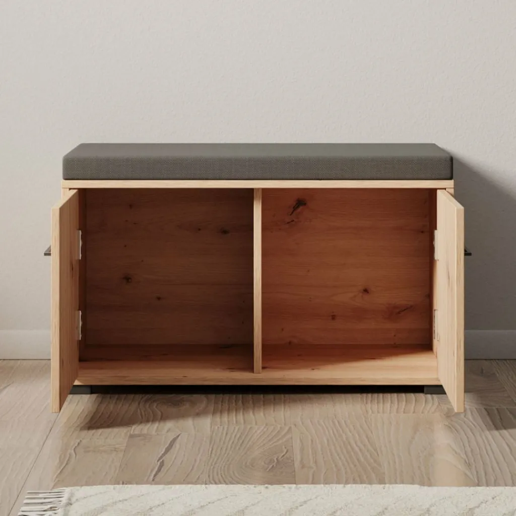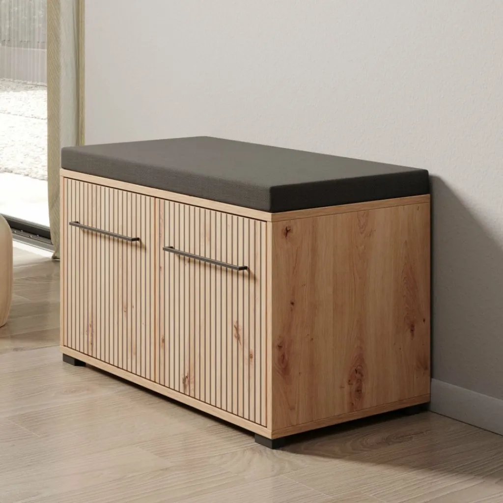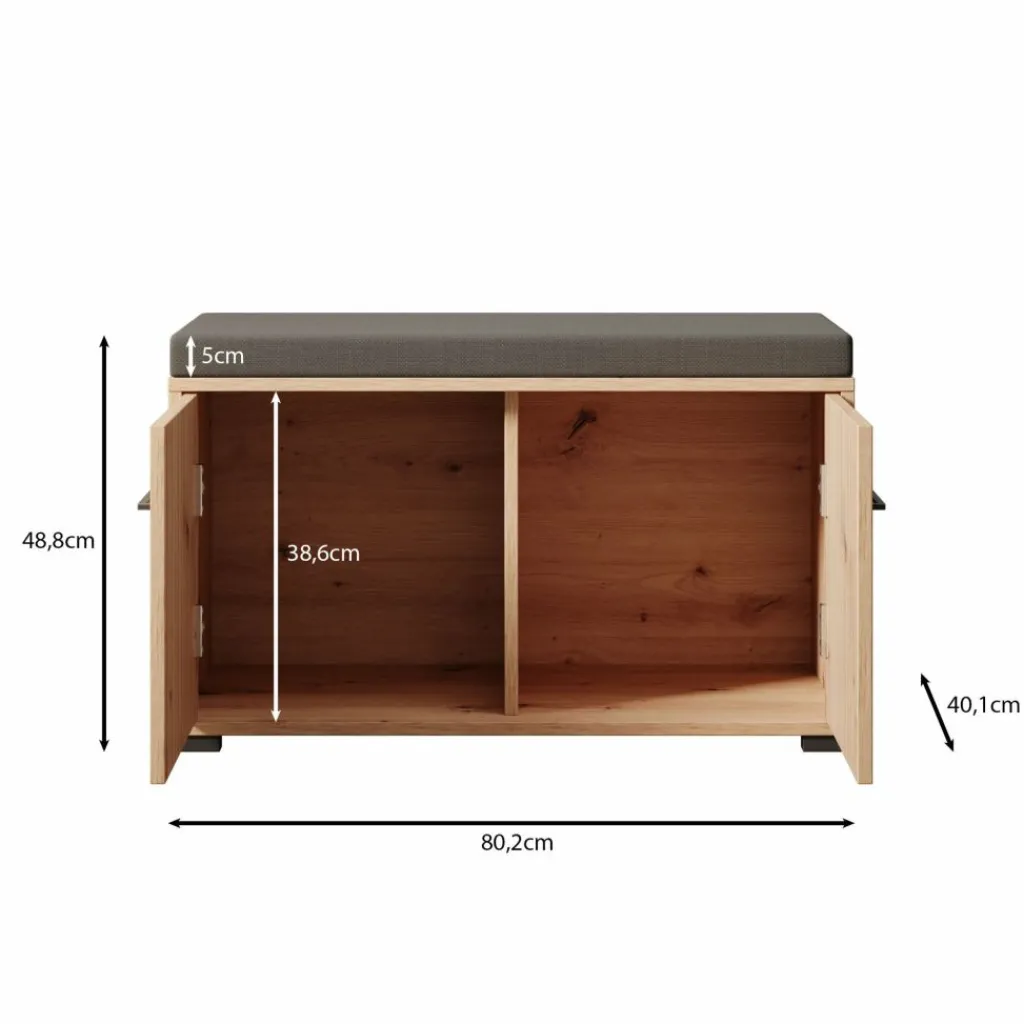 Schoenenkast Lobos is een modern meubel in de kleur eiken, welke is geschikt voor het opbergen van je schoenen. Het kastje is voorzien van 2 deuren die te openen zijn met een zwarte handgreep. Hierachter zitten in totaal 2 opbergvakken. Het meubel heeft een kussentje op het bovenblad.