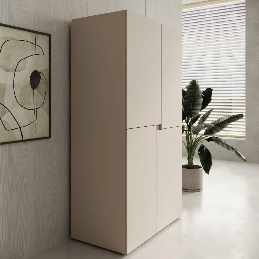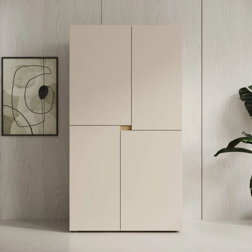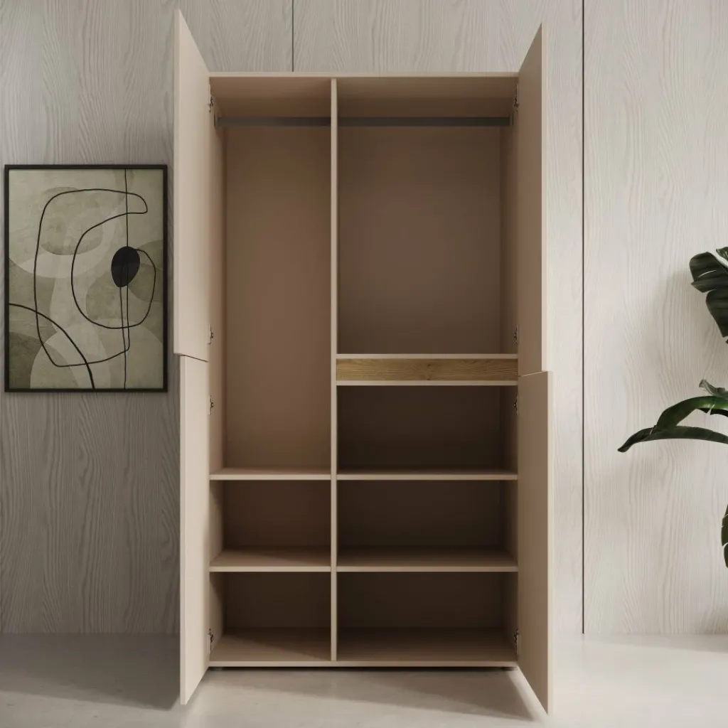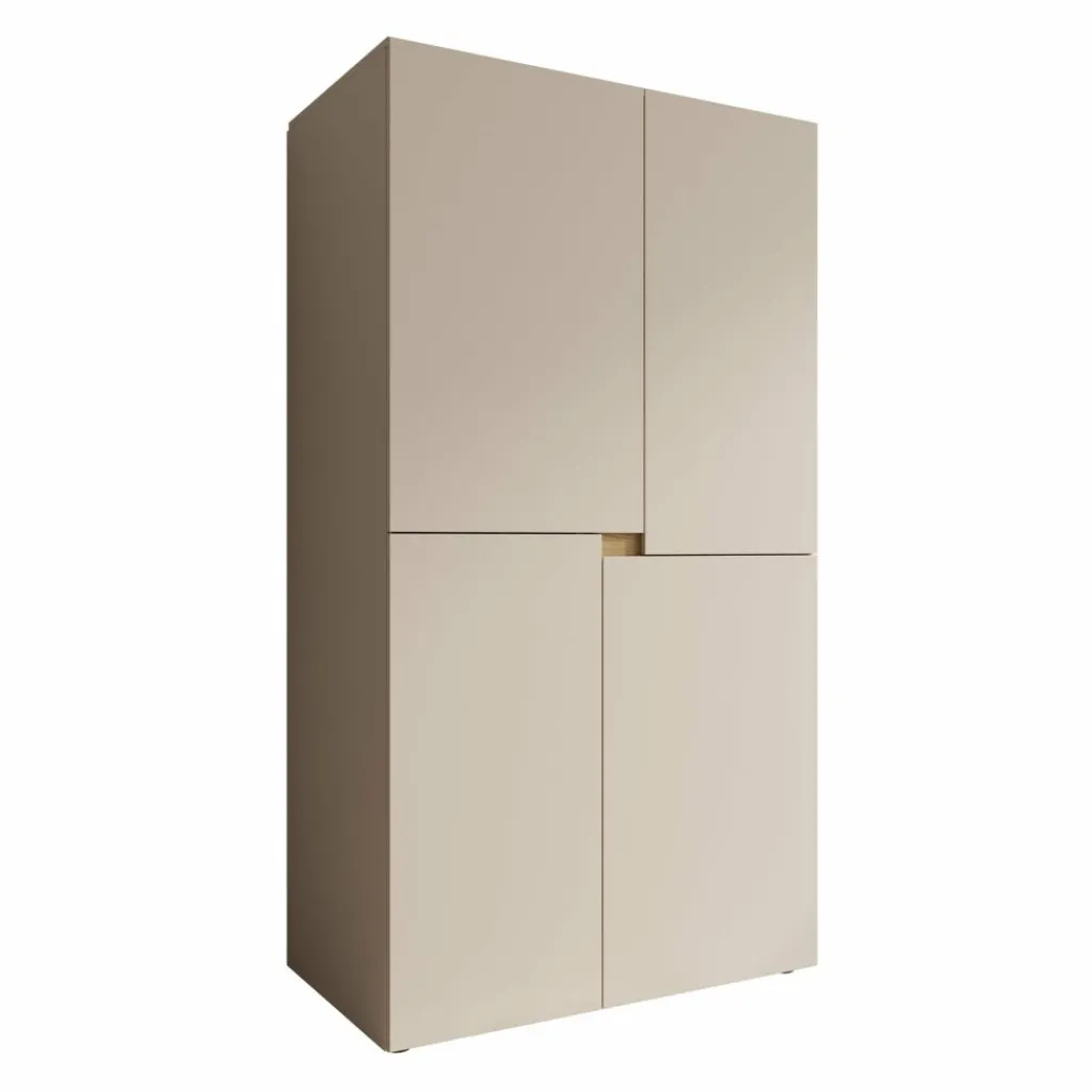 De Lombok kledingkast 4-deurs in beige is een praktische opbergkast met een rustige, moderne uitstraling. Dankzij de strakke fronten zonder handgrepen past deze kast moeiteloos in een eigentijdse slaapkamer of woonruimte. Achter de vier deuren vind je een ruime indeling met een hanggedeelte voor kledingstukken en meerdere open vakken voor bijvoorbeeld stapels kleding, dozen of accessoires.