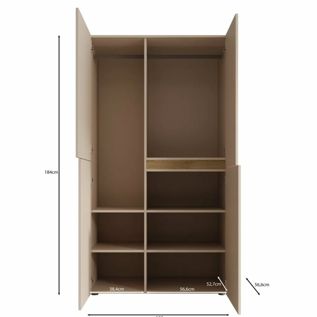 De subtiele beige kleur zorgt voor een warme, neutrale basis in je interieur. Met een breedte van 100 cm en een hoogte van 184 cm is deze kast geschikt voor compacte ruimtes, terwijl de opbergmogelijkheden ruim zijn opgezet. Ideaal wanneer je overzicht en functionaliteit belangrijk vindt.