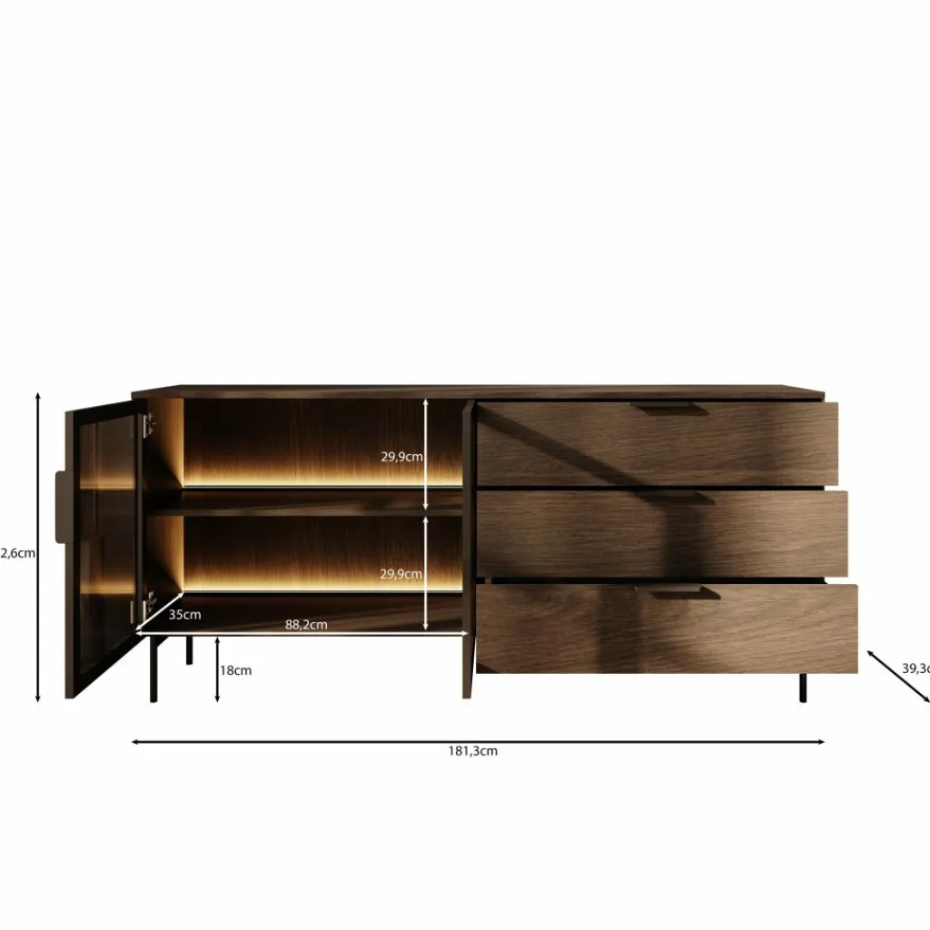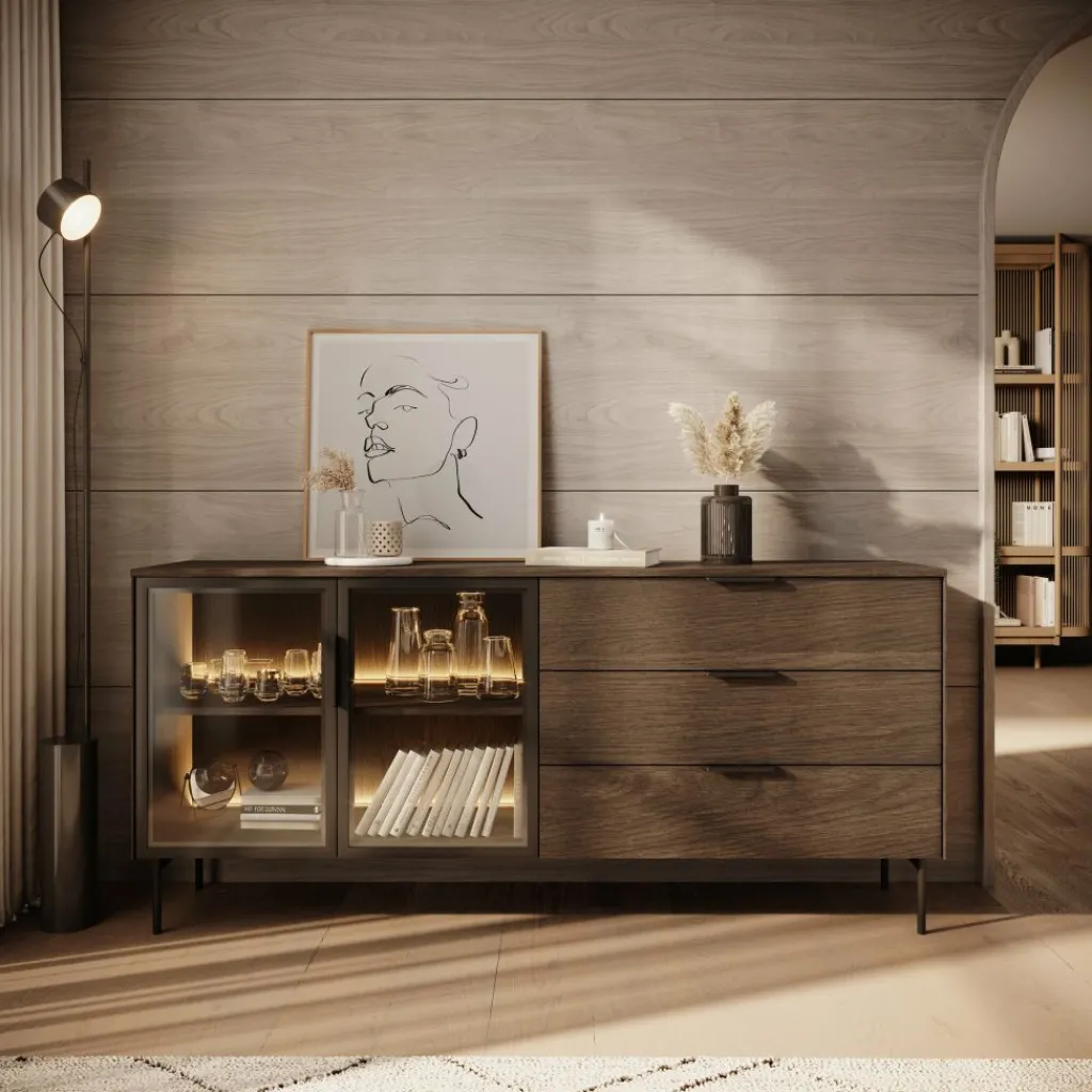 Het Lomo dressoir in donker eikenlook beschikt over drie ruime lades en een vitrinedeur met glas en geïntegreerde ledverlichting. Zo wissel je eenvoudig tussen gesloten en zichtbaar opbergen. Achter het glas kun je servies, boeken of decoratieve accessoires plaatsen, terwijl de lades geschikt zijn voor items die je liever uit het zicht houdt.