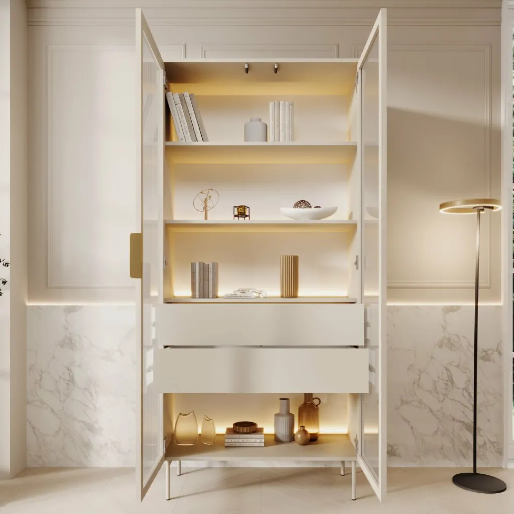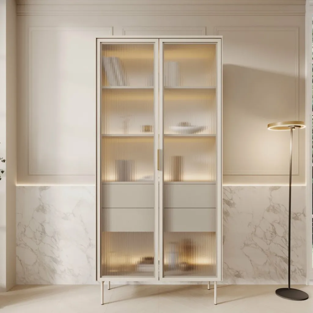 De Lomo vitrinekast in beige combineert een verfijnde uitstraling met praktische opbergruimte. De twee glazen deuren met verticale structuur geven een lichte en elegante look, terwijl de binnenzijde voorzien is van meerdere legplanken en twee ruime lades voor geordende opslag.