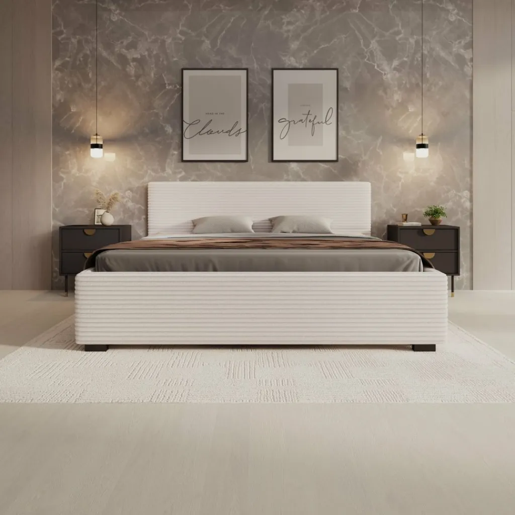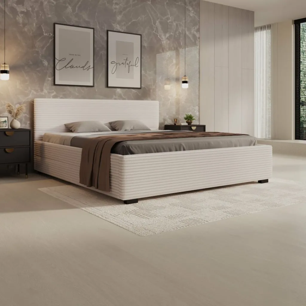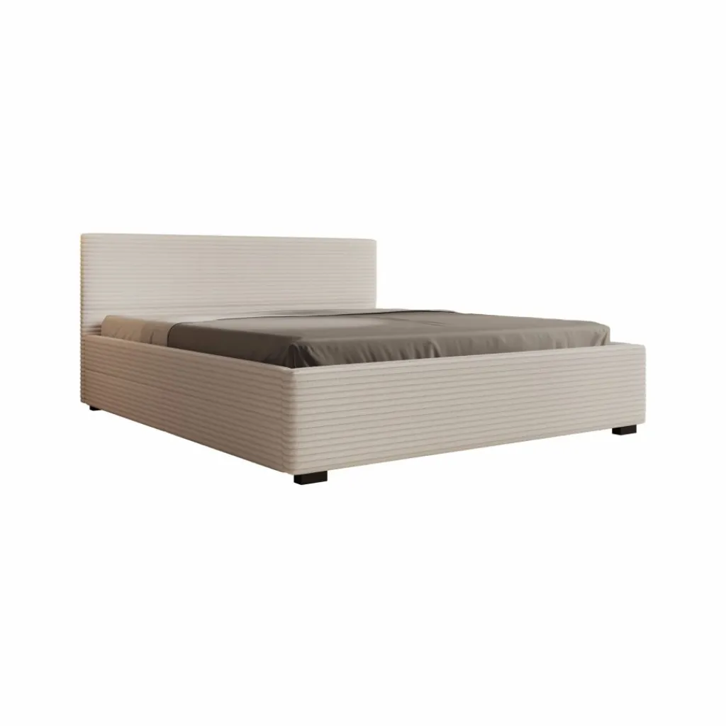 Het Loox bed in 180×200 cm is het grootste formaat binnen de serie en biedt een breed ligvlak voor twee personen. De ribstofbekleding en rechte vormgeving blijven ook in deze uitvoering duidelijk aanwezig. De constructie is stevig opgebouwd en geschikt voor dagelijks gebruik. Het bed wordt geleverd inclusief lattenbodem en zonder matras.