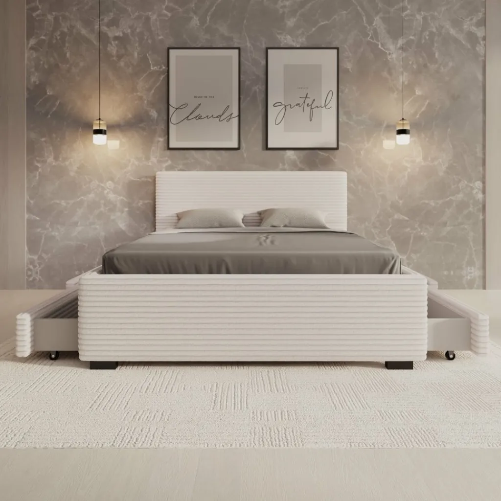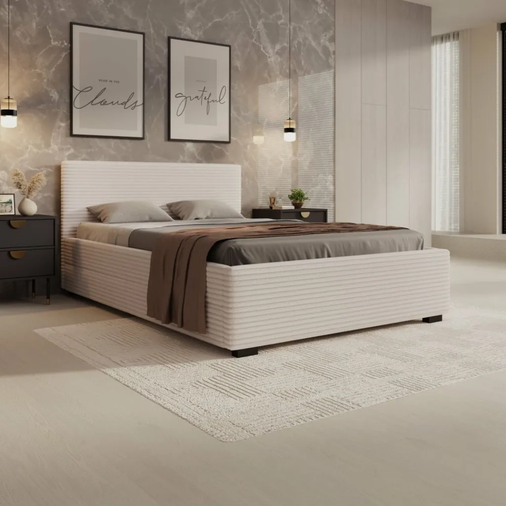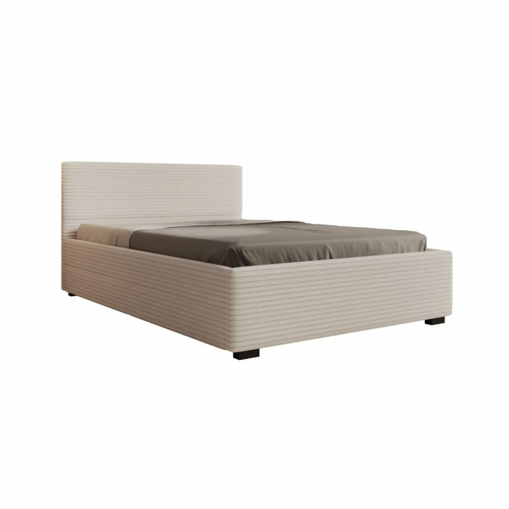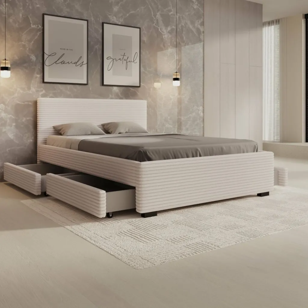 Het Loox bed heeft een strak en functioneel frame met een bekleding in beige ribstof. De verticale ribstructuur zorgt voor duidelijke lijnvoering, waardoor het bed goed aansluit bij hedendaagse interieurs. De stevige basis en de hogere rand rondom het liggedeelte geven het meubel een solide geheel. Het bed wordt geleverd inclusief lattenbodem en zonder matras.