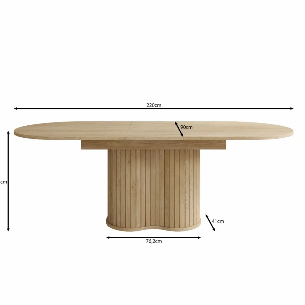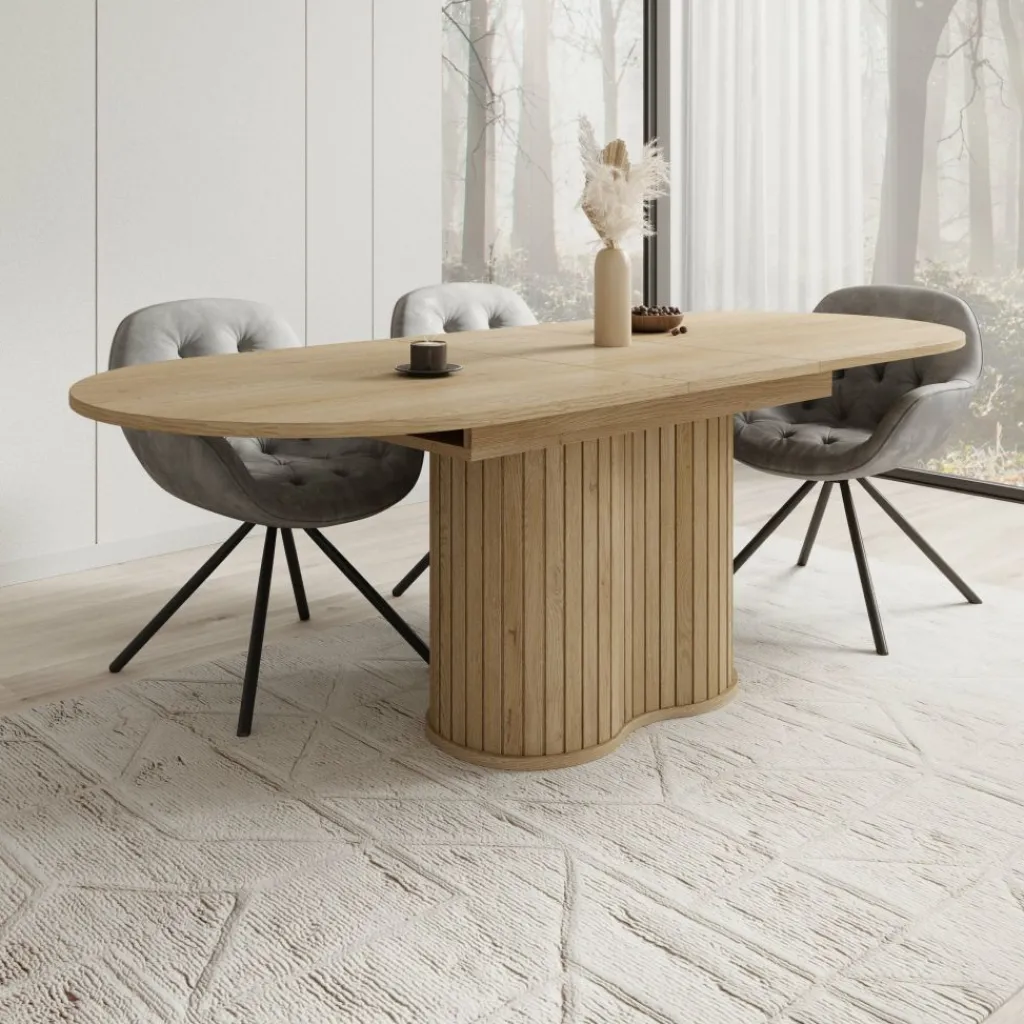 De eetkamertafel Loro is een ovale tafel uitgevoerd in een eikenpatroon met een afmeting van 180x90x76 cm. De tafel is uitschuifbaar en kan worden verlengd tot 220 cm, waardoor extra zitplaatsen kunnen worden gecreëerd wanneer dat nodig is. De ovale vorm zorgt voor een gelijkmatige verdeling van de ruimte rondom de tafel.
