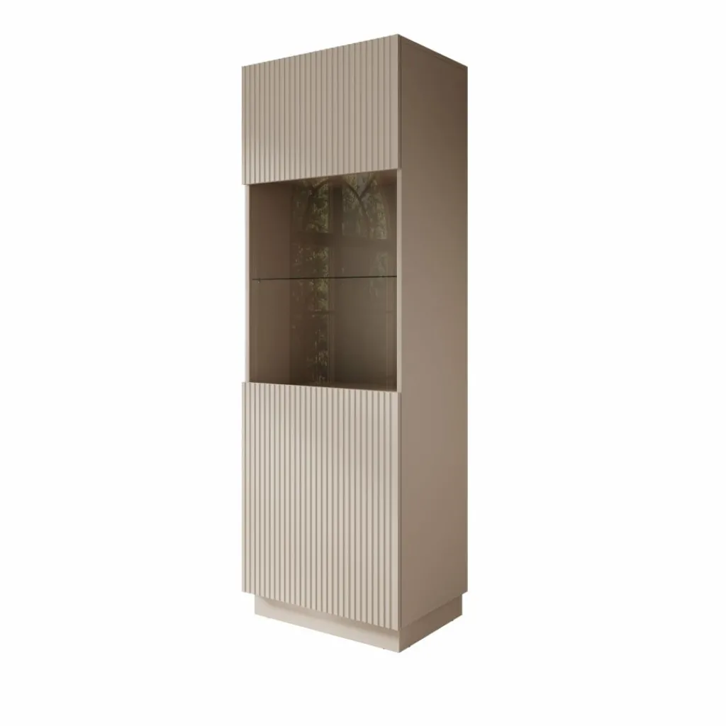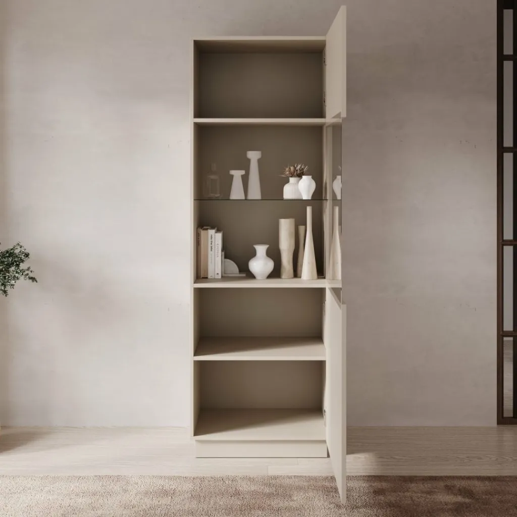 De Lucera vitrinekast in beige is een smalle en hoge kast die geschikt is voor het opbergen en presenteren van verschillende items. In het midden bevindt zich een open vak met een glazen plank, ideaal voor decoratie, servies of andere accessoires. Achter de deuren bevinden zich extra opbergvakken met legplanken voor spullen die je liever uit het zicht bewaart.