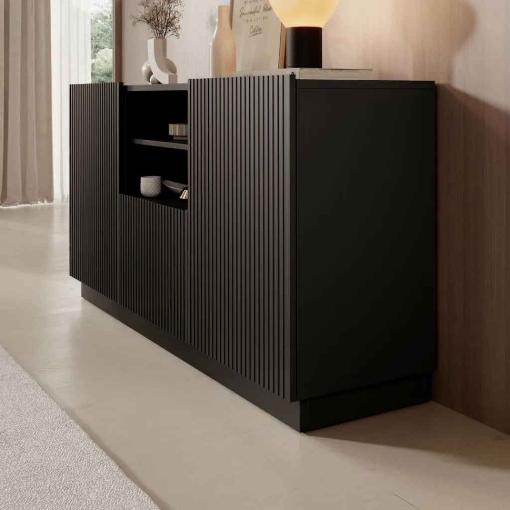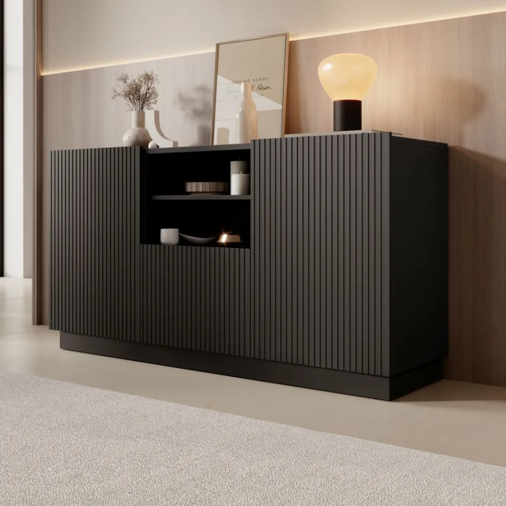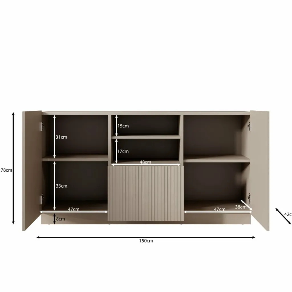 Het Lucera dressoir biedt praktische opbergruimte met een overzichtelijke indeling en een strak design. Met een breedte van 150 cm, een diepte van 42 cm en een hoogte van 78 cm is het meubel geschikt voor het opbergen van servies, woonaccessoires en andere spullen. Het bovenblad kan gebruikt worden voor decoratie zoals vazen, fotolijsten of een tafellamp.