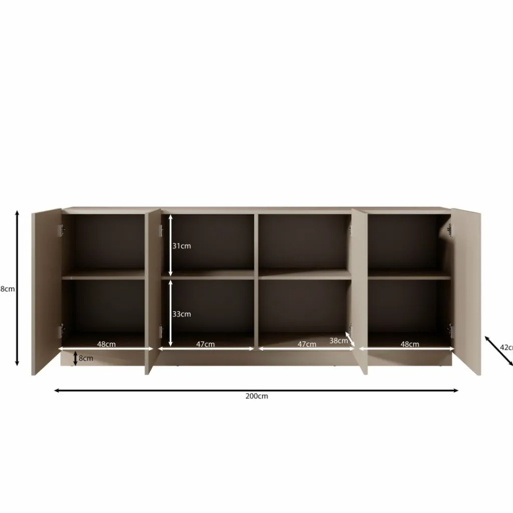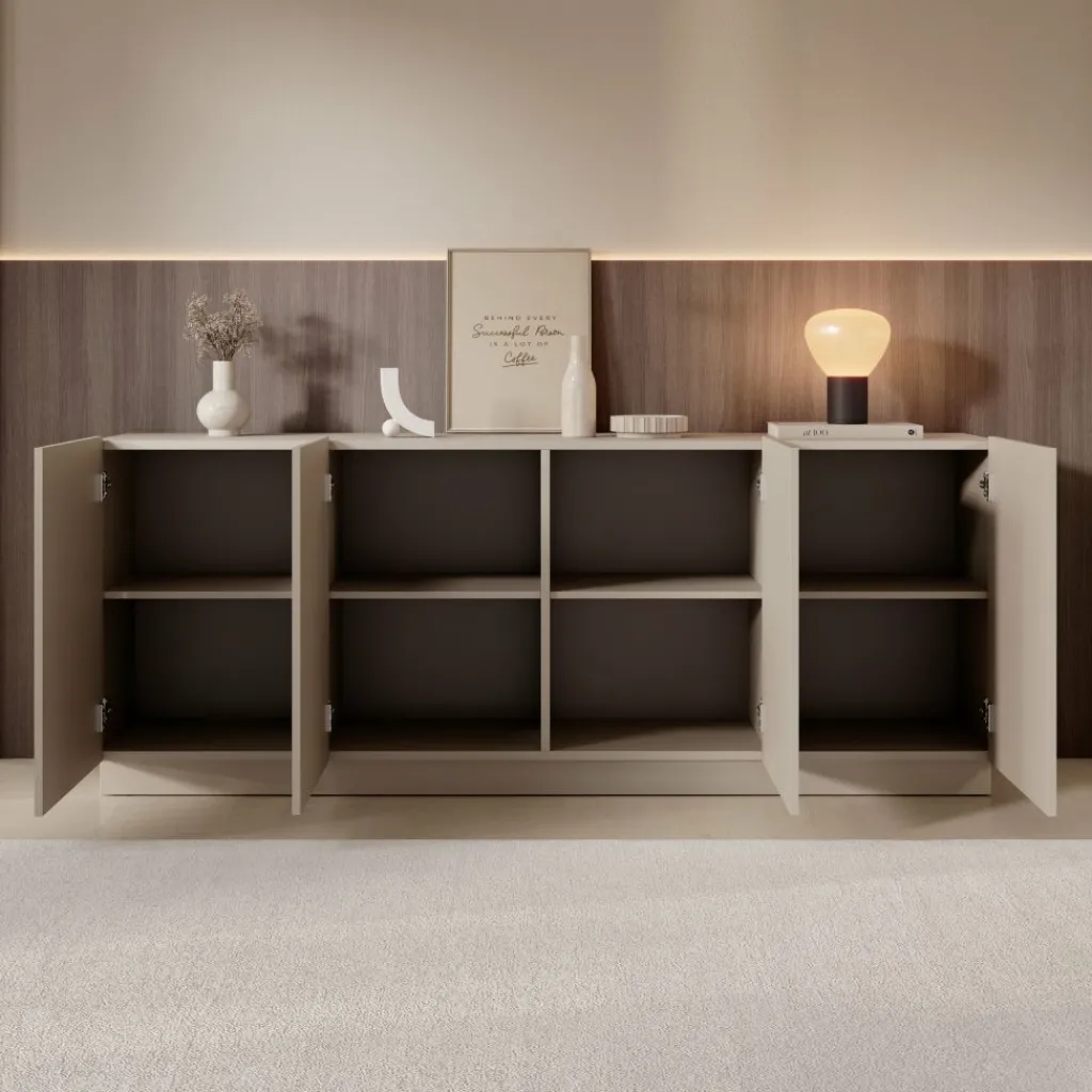 Het Lucera dressoir in beige is een ruim opbergmeubel met een strak en modern ontwerp. Met een breedte van 200 cm biedt dit dressoir veel praktische opbergruimte voor servies, accessoires en andere woonitems. Achter de vier deuren bevinden zich meerdere compartimenten met legplanken, waardoor je spullen overzichtelijk kunt opbergen.