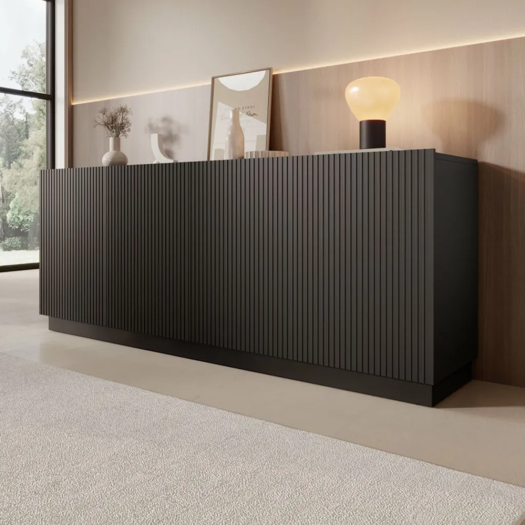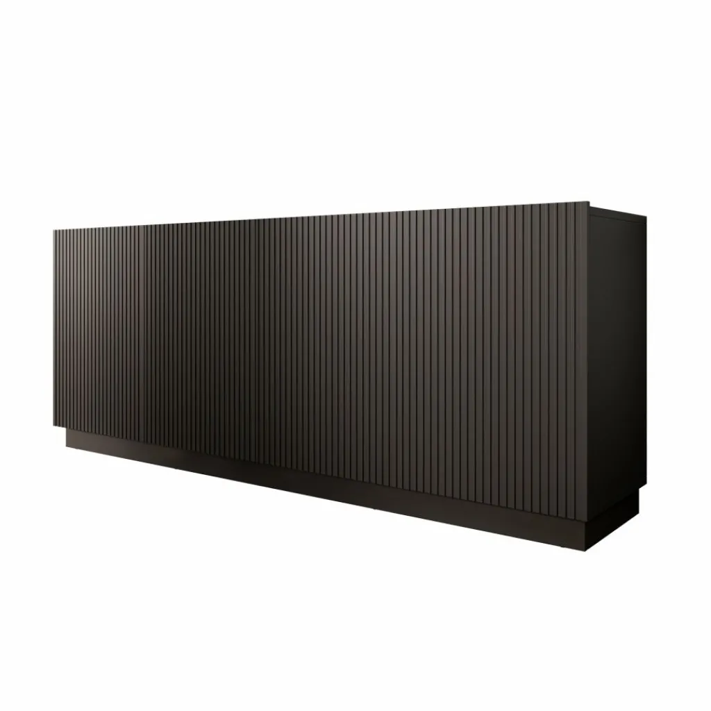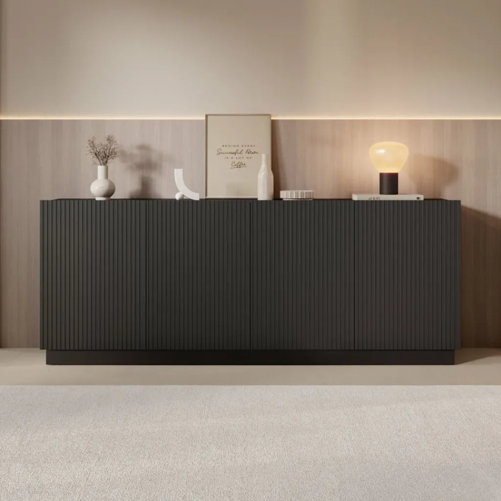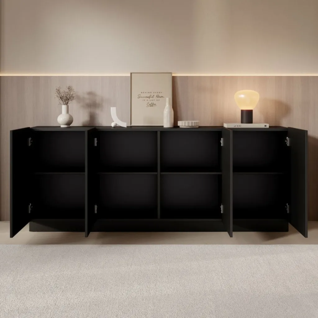 Het Lucera dressoir in zwart is een ruim opbergmeubel met een strak en modern ontwerp. Met een breedte van 200 cm biedt dit dressoir veel praktische opbergruimte voor servies, accessoires en andere woonitems. Achter de vier deuren bevinden zich meerdere compartimenten met legplanken, waardoor je spullen overzichtelijk kunt opbergen.