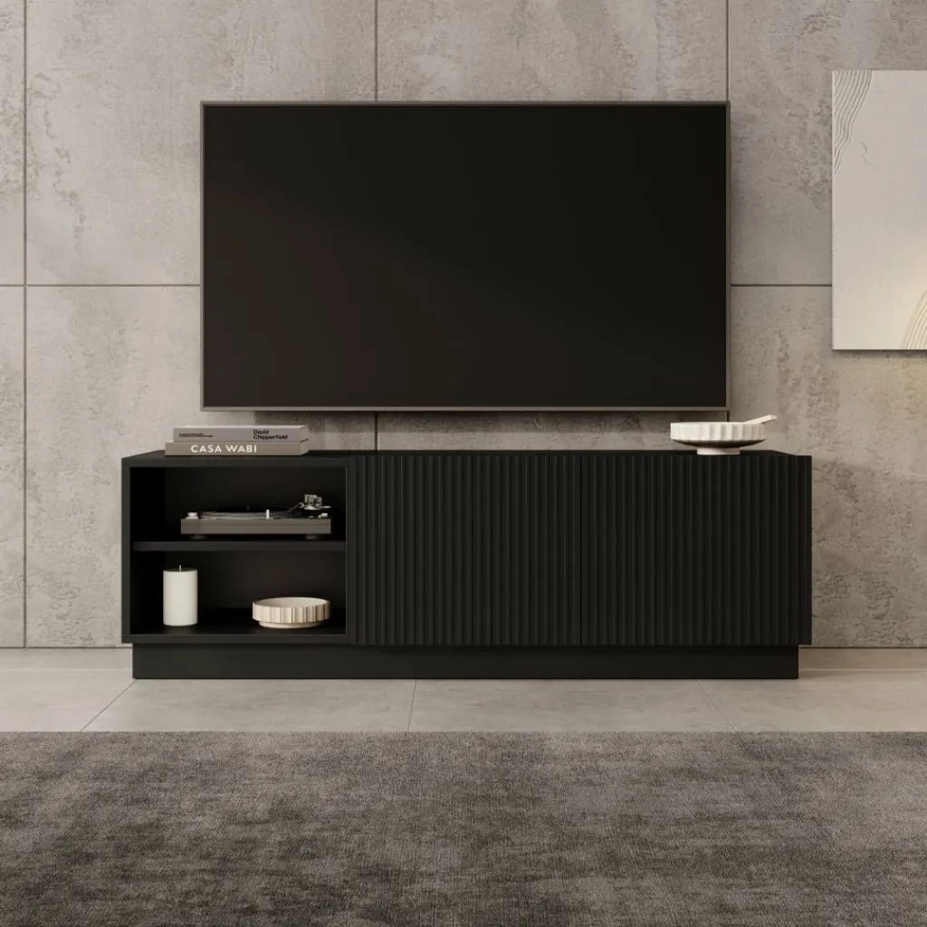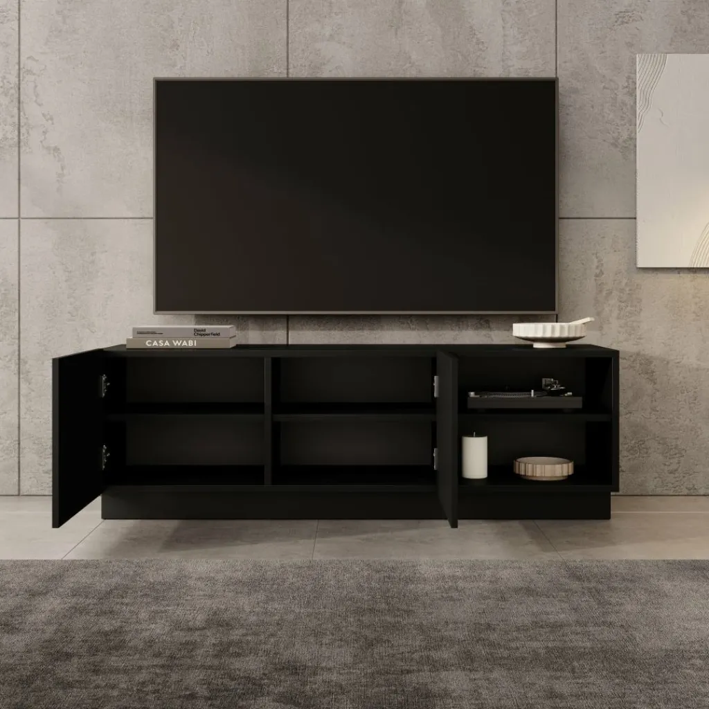 Het Lucera tv-meubel in zwart is een laag en strak vormgegeven meubel dat een stevige basis vormt onder je televisie. Met een breedte van 150 cm is er voldoende ruimte voor een tv en verschillende media-apparaten. Achter de twee deuren bevinden zich opbergvakken met legplanken, terwijl het open vak geschikt is voor apparatuur zoals een decoder, spelconsole of mediaspeler.