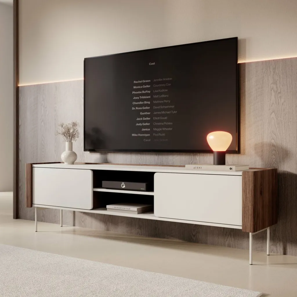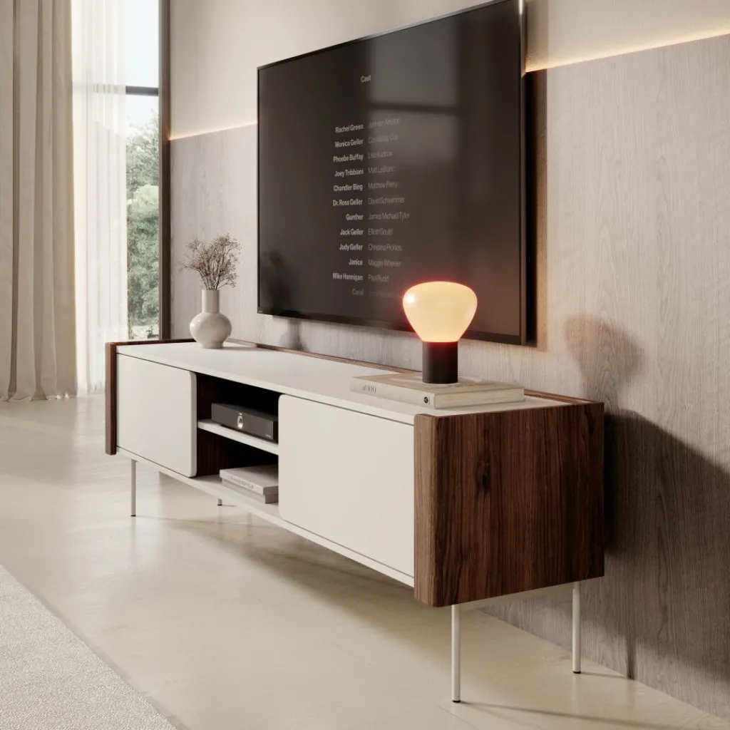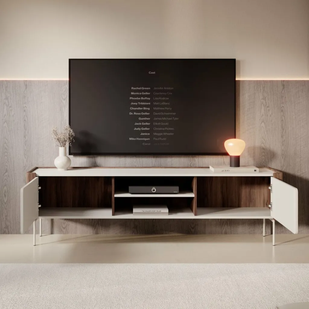 TV-Meubel Lux is een opbergkast voor onder de tv en staat op metalen poten. De TV-kast is gemaakt in een beige met eiken kleur. TV-Meubel Lux beschikt over 2 deuren waarachter in totaal 2 opbergvakken zitten. Deze deuren openen met het push to open systeem. Ook heeft het meubel nog 2 open vakken. Hier zit in de achterwand 1 uitsparing om bedrading te kunnen wegwerken.