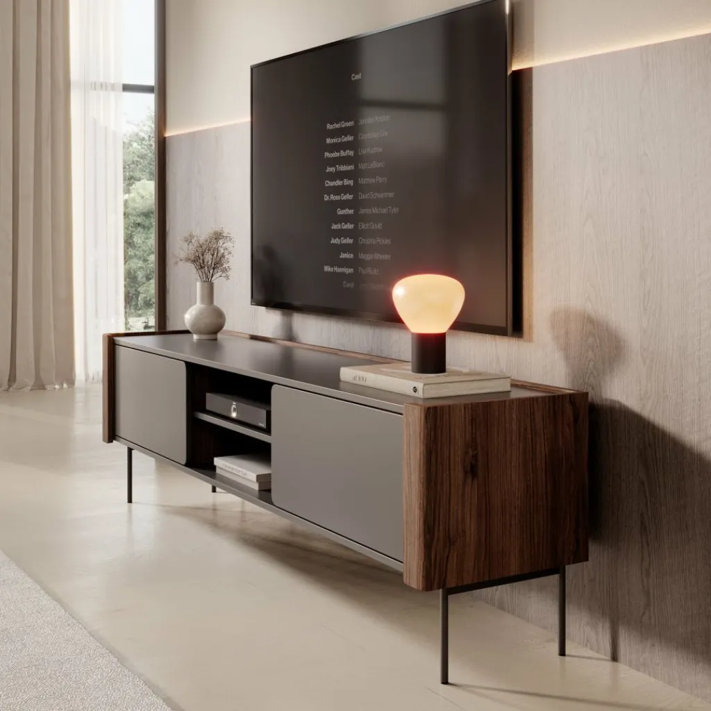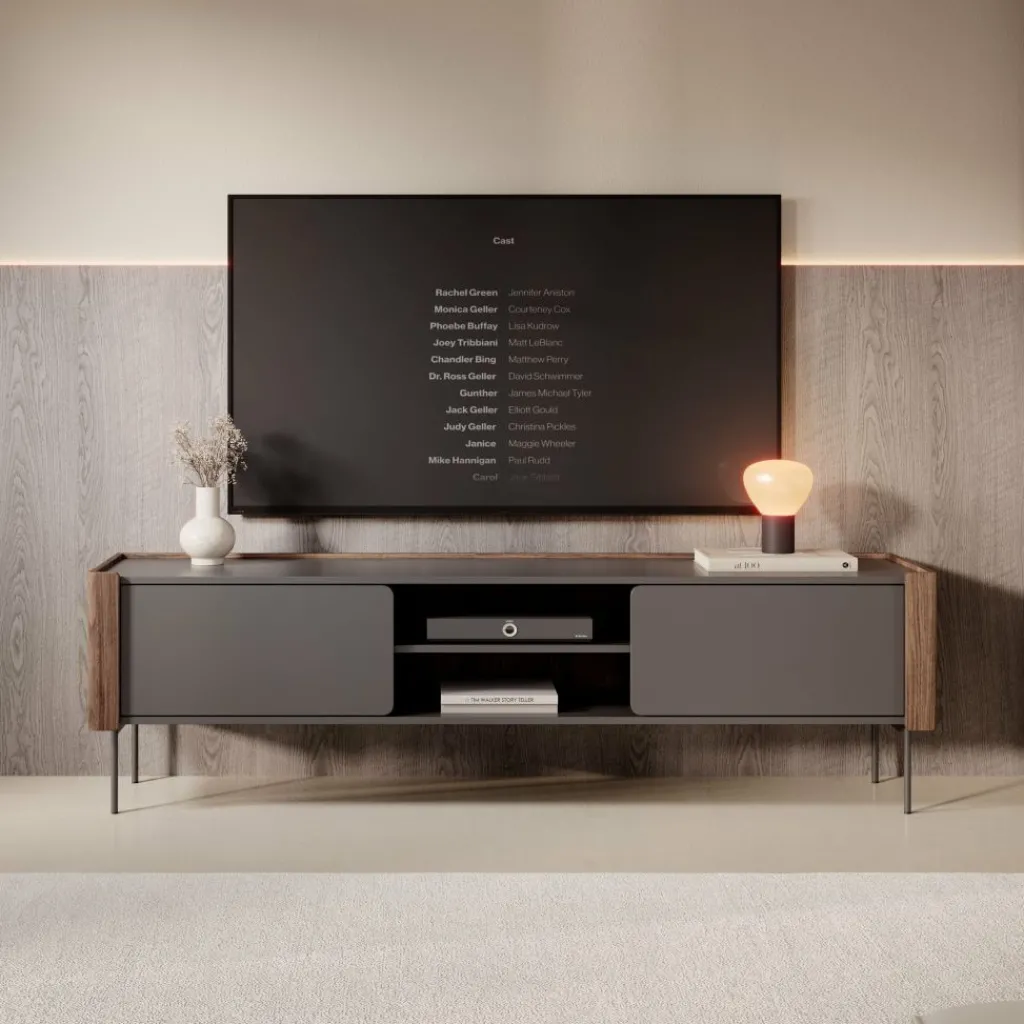 Het Lux tv-meubel combineert een matzwart front met warme houtaccenten aan de zijkanten. De afgeronde hoeken en strakke lijnen zorgen voor een rustige, moderne uitstraling die goed past in eigentijdse woonkamers. Dankzij de slanke metalen poten oogt het meubel licht en blijft de ruimte eromheen makkelijk toegankelijk.