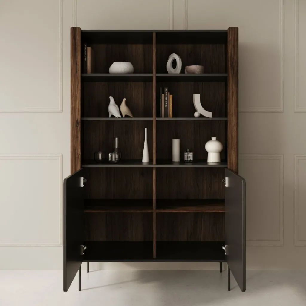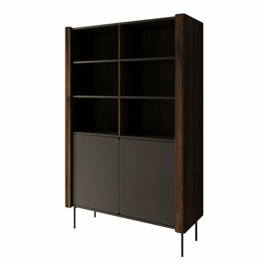 De Lux boekenkast is uitgevoerd in een matzwarte kleur en combineert open schappen met een gesloten onderkast. Hierdoor kun je zowel decoratieve items als spullen die je liever uit het zicht houdt netjes opbergen. De zijkanten hebben een warme houtstructuur, wat zorgt voor een duidelijk contrast met het zwarte front.