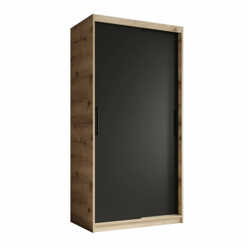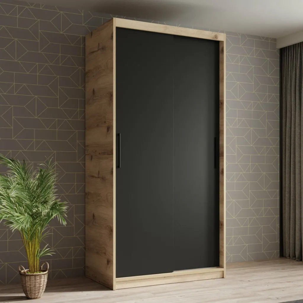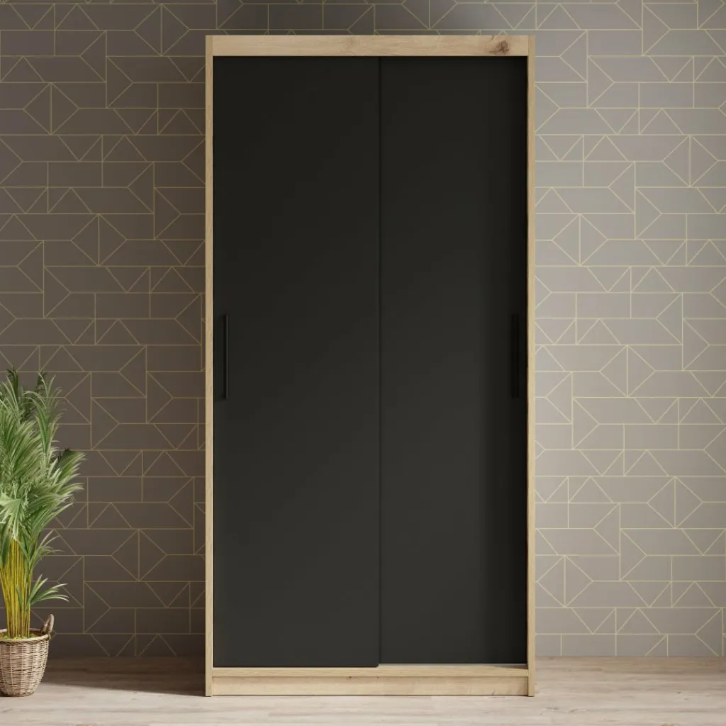 Garderobekast Luxor is een moderne kast met mat zwarte deuren en een eiken kleurige ombouw. De kledingkast heeft twee schuifdeuren die te bedienen zijn met stevige handgrepen. In de binnenkant vind je 5 opbergvakken en 2 stangen om kleding aan op te hangen.