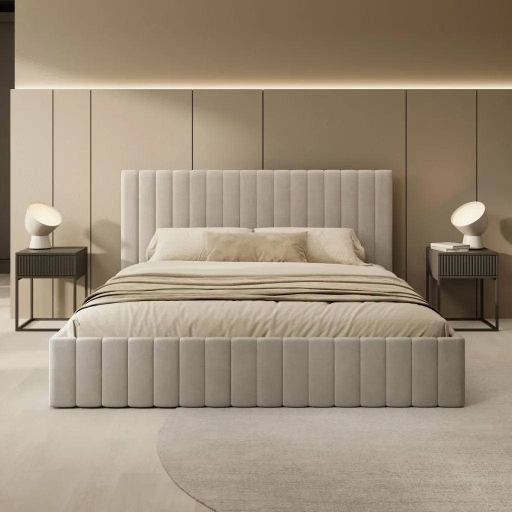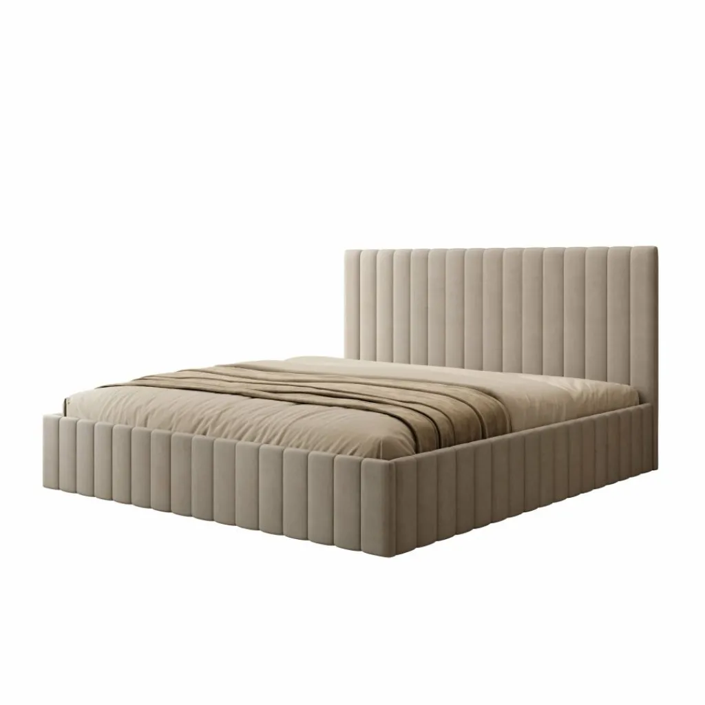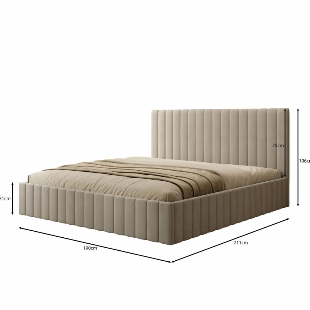 Het Luz bed van 180×200 cm is voorzien van een geïntegreerde opbergruimte onder het matrasgedeelte, bereikbaar via een opklapmechanisme. Dit biedt een groot en praktisch opbergvak voor het bewaren van bijvoorbeeld beddengoed of seizoensartikelen. Het bed is afgewerkt in beige velvet en heeft een hoofdbord met verticale banen.