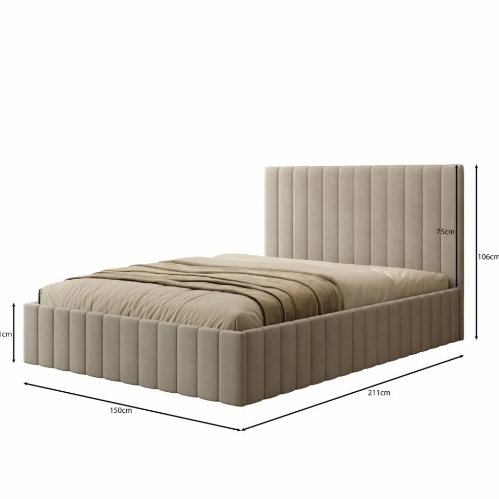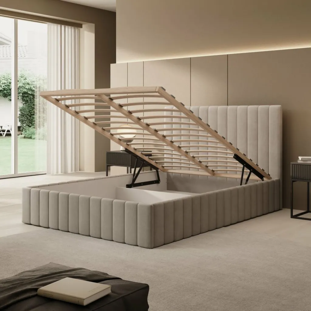 Het Luz bed biedt een combinatie van slaapcomfort en praktische opbergruimte. Het bed is uitgevoerd in beige velvet en heeft een recht en strak hoofdbord. Dankzij het liftmechanisme onder de lattenbodem ontstaat een ruime opbergbak, geschikt voor het opbergen van dekens, kussens of seizoensspullen.