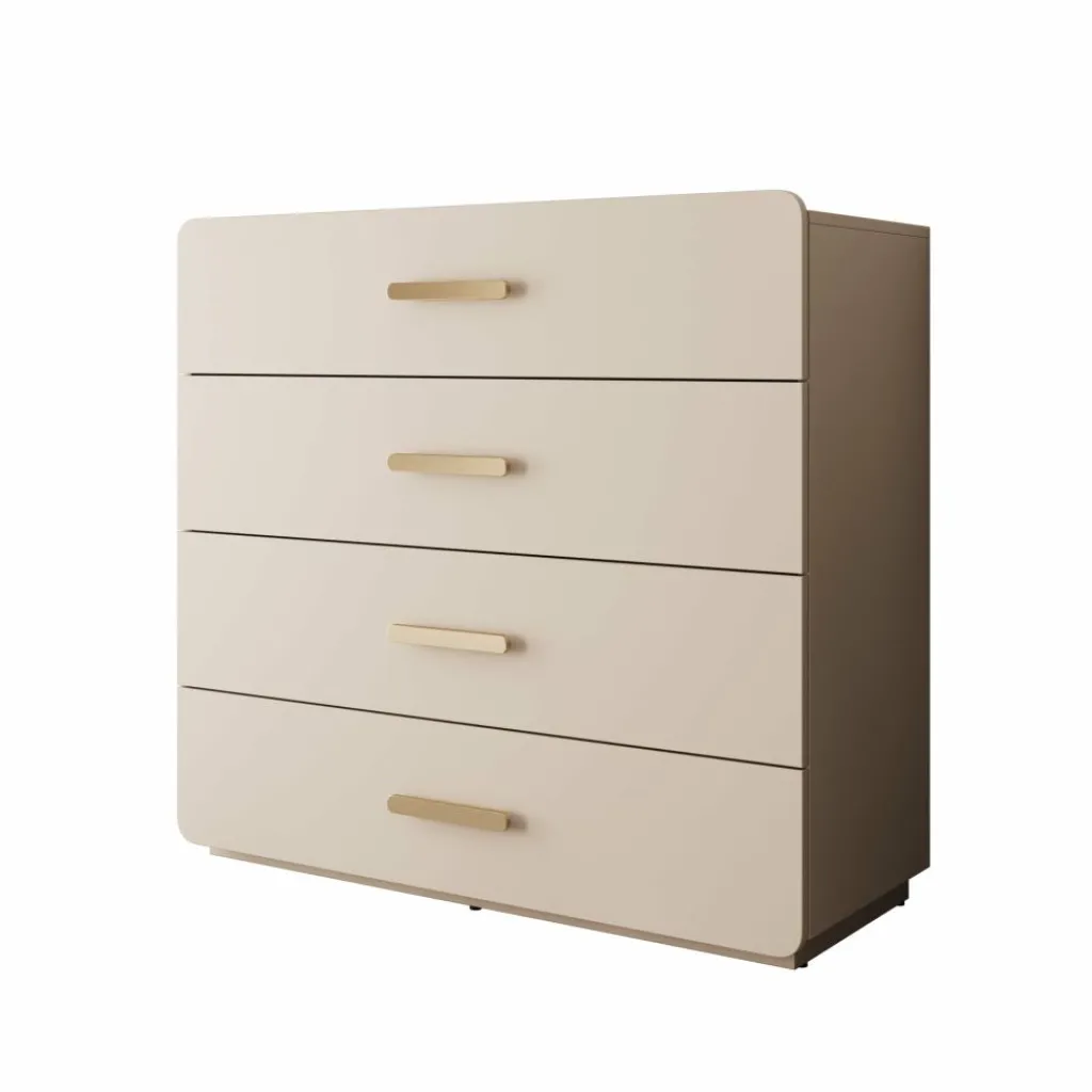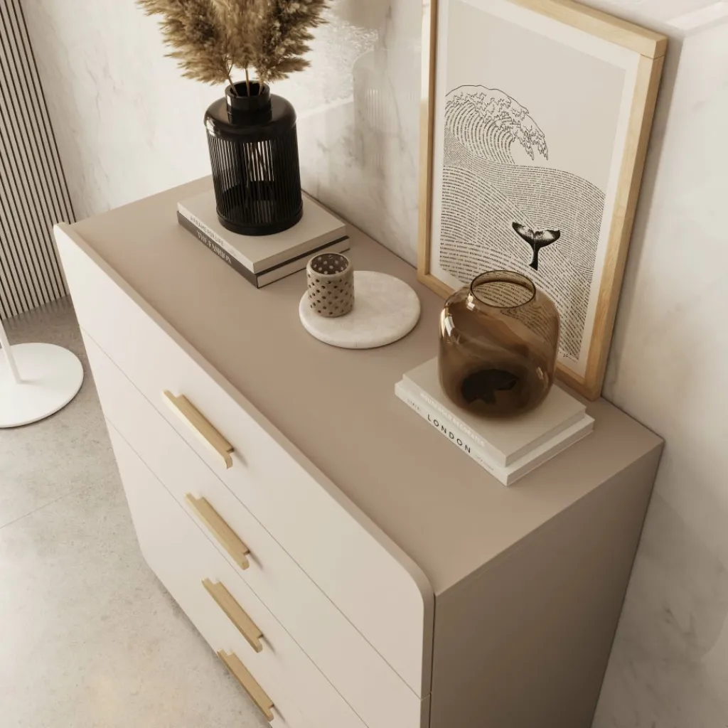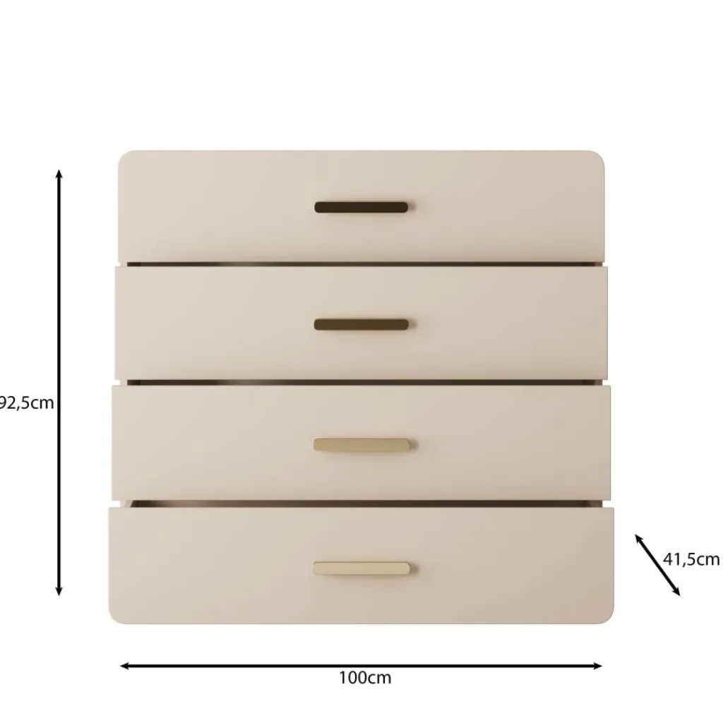 De Luzon ladekast in beige is een stijlvolle en praktische toevoeging aan je interieur. Met zijn strakke ontwerp en zachte kleur past hij moeiteloos in verschillende woonstijlen. De kast is voorzien van vier ruime lades, ideaal voor het netjes opbergen van kleding, linnengoed of andere spullen. Dankzij het compacte formaat van 100x42x92 cm is de ladekast ook geschikt voor kleinere ruimtes, zoals een slaapkamer of hal. De subtiele handgrepen en afgeronde hoeken geven het geheel een moderne en verfijnde uitstraling.