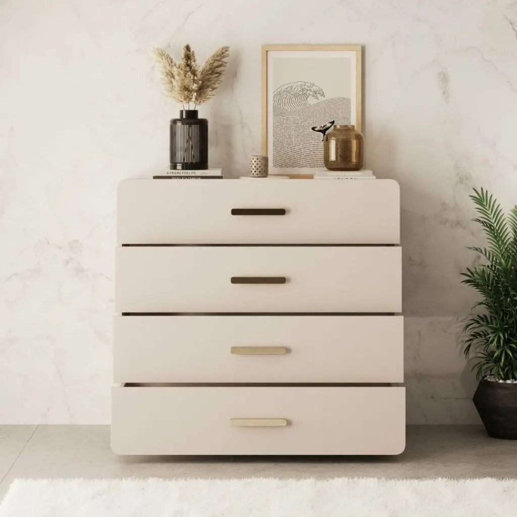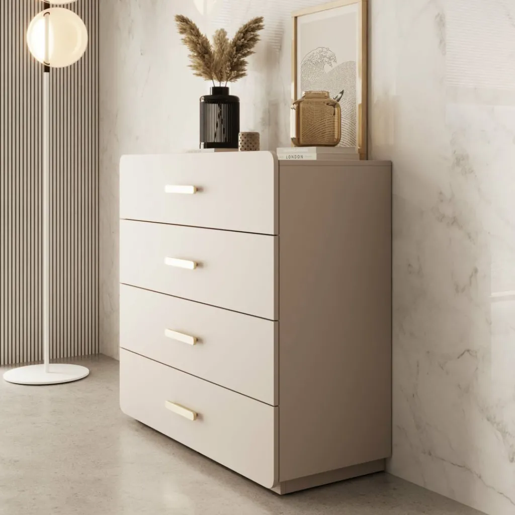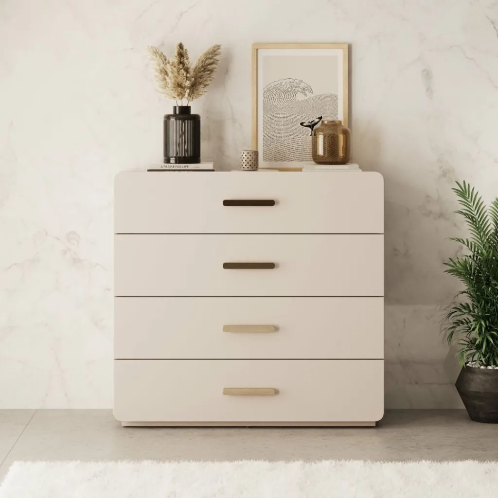 De Luzon ladekast in beige is een stijlvolle en praktische toevoeging aan je interieur. Met zijn strakke ontwerp en zachte kleur past hij moeiteloos in verschillende woonstijlen. De kast is voorzien van vier ruime lades, ideaal voor het netjes opbergen van kleding, linnengoed of andere spullen. Dankzij het compacte formaat van 100x42x92 cm is de ladekast ook geschikt voor kleinere ruimtes, zoals een slaapkamer of hal. De subtiele handgrepen en afgeronde hoeken geven het geheel een moderne en verfijnde uitstraling.