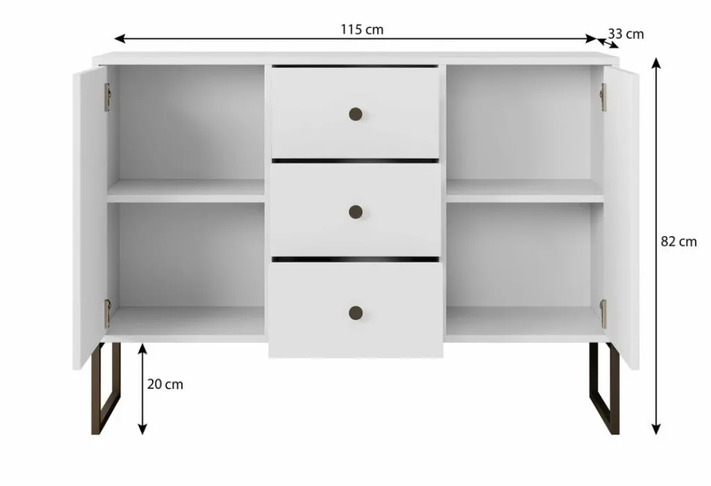 De kast heeft 2 deuren en 3 lades welke te openen zijn met zwarte knoppen. Achter deze deuren bevinden zich 4 opbergvakken.