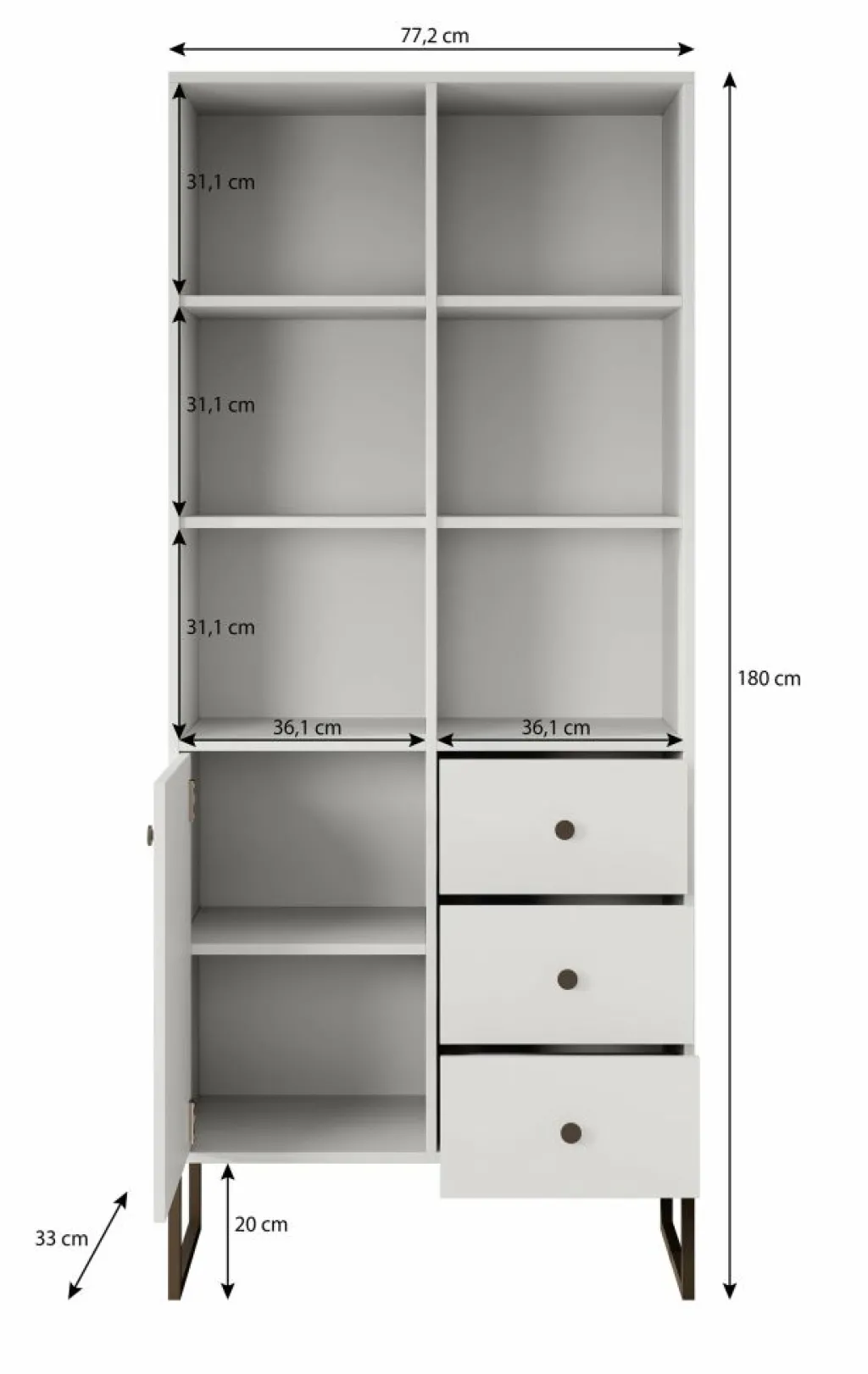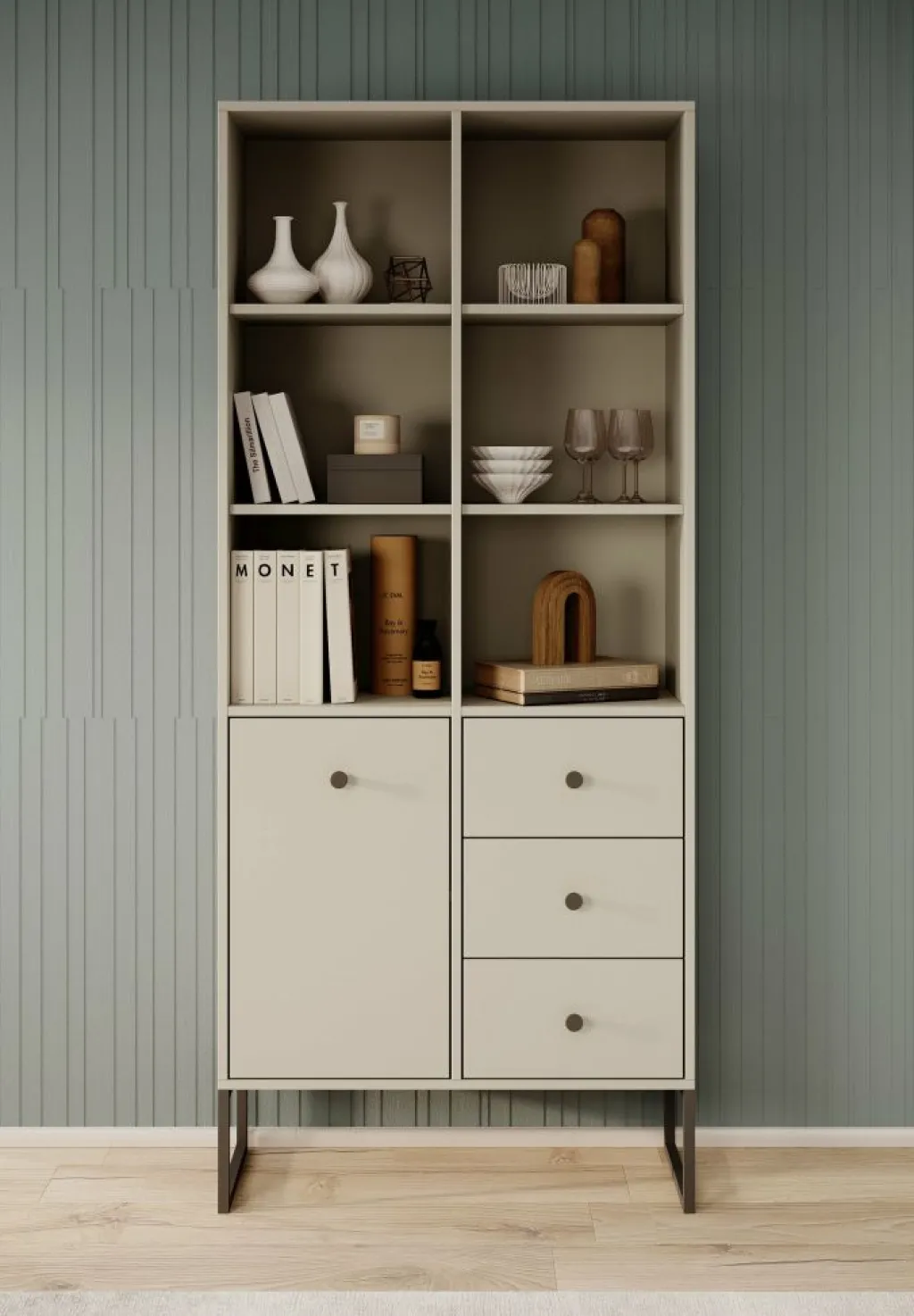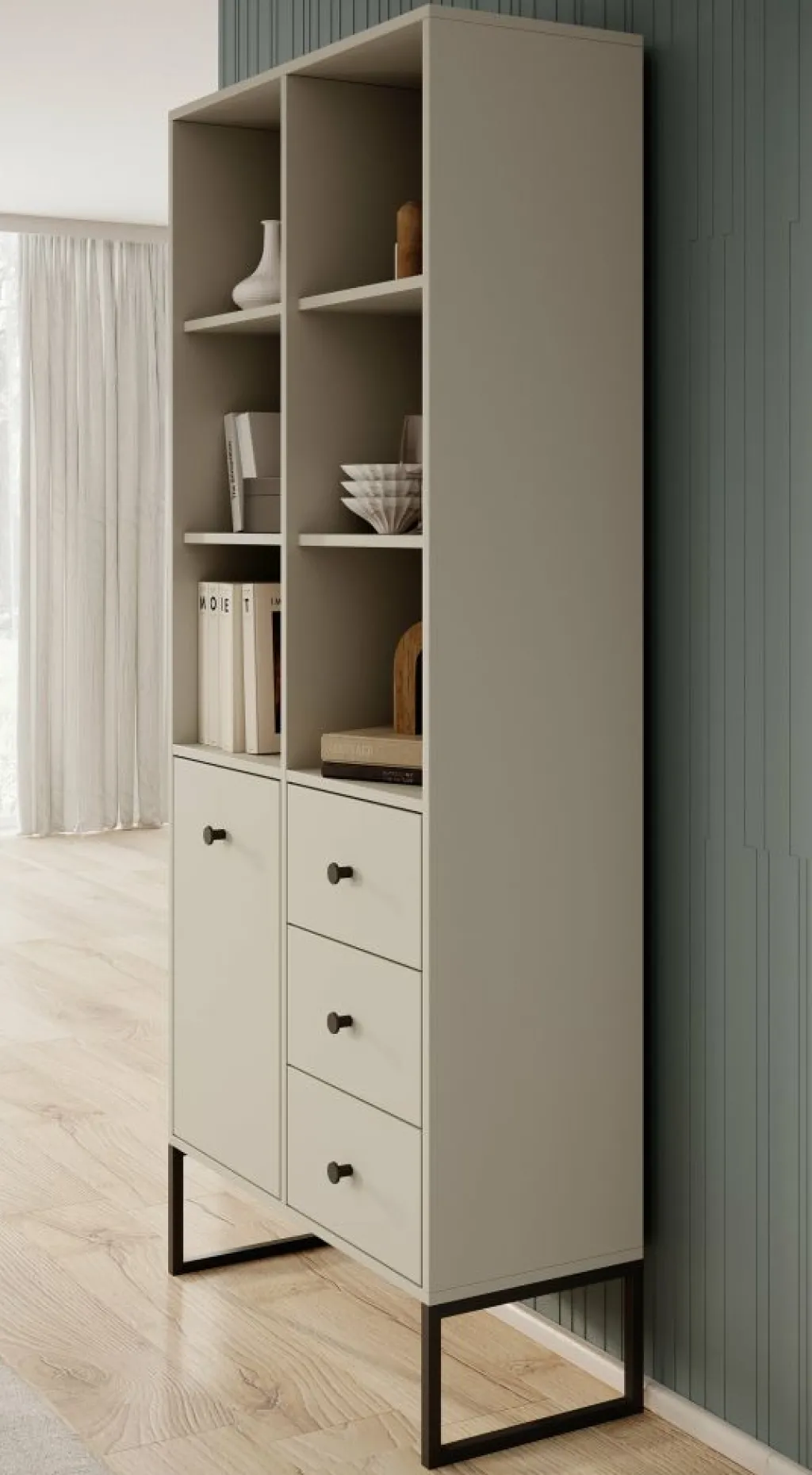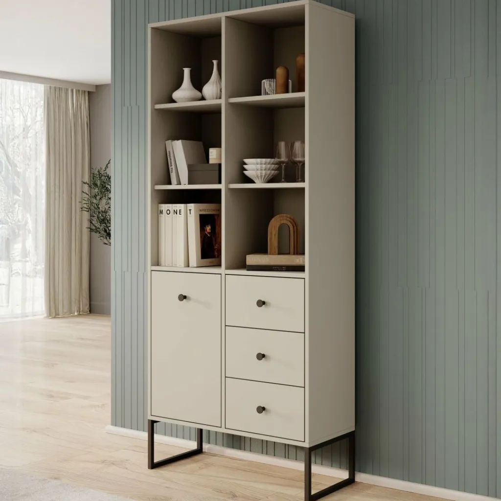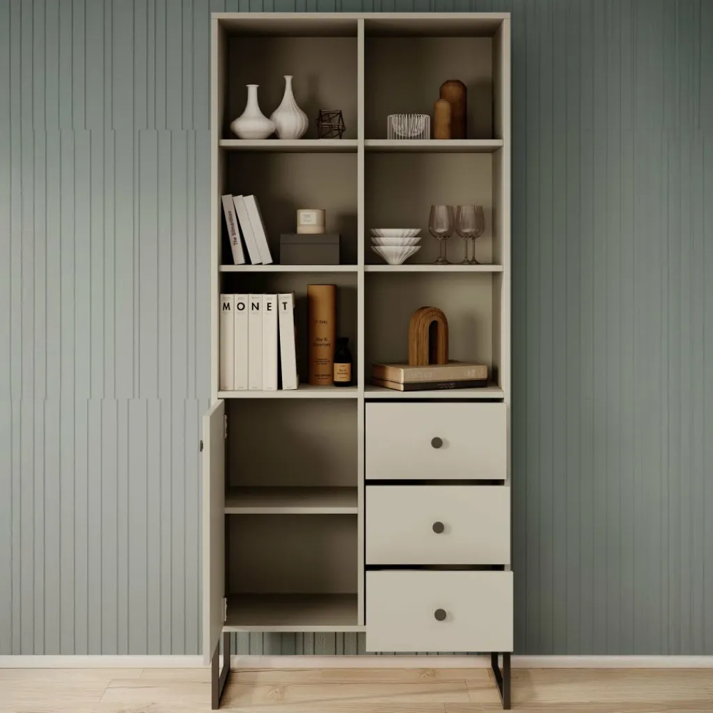 Boekenkast Lyndall is een moderne kast uitgevoerd in een beige kleur. De kast beschikt over 6 open vakken met daaronder 3 lades en 1 deur. Deze lades en deur zijn te openen met zwarte knoppen. Achter de deur zijn nog 2 opbergvakken te vinden. De Lyndall staat op zwarte pootjes die gemaakt zijn van metaal.