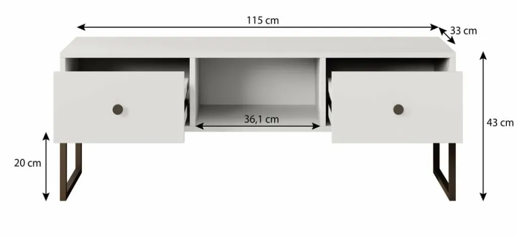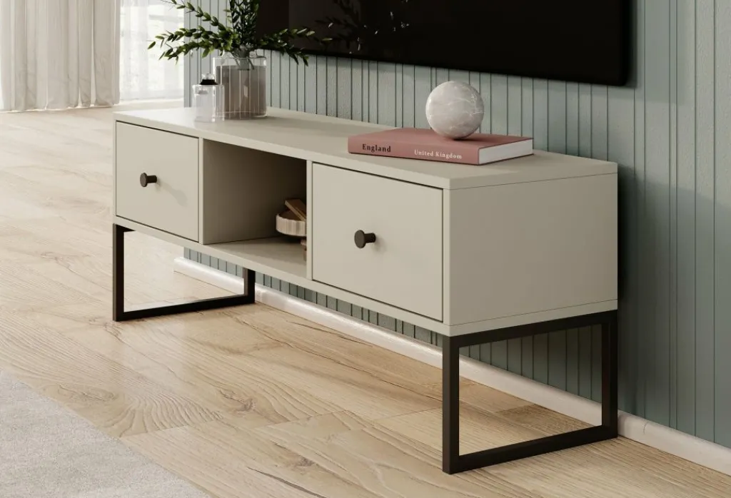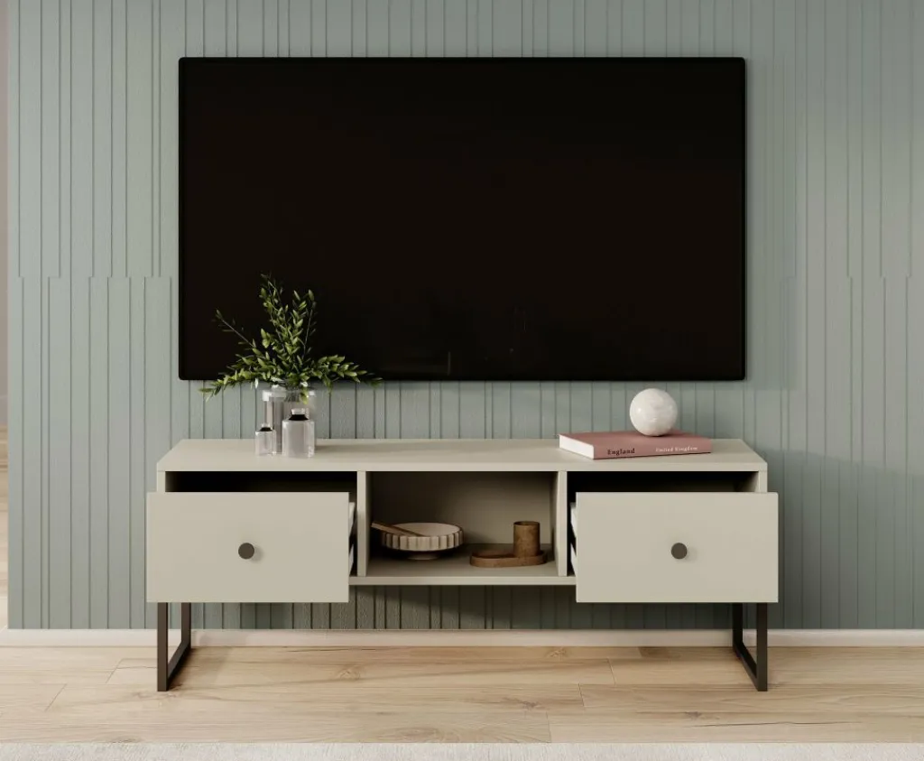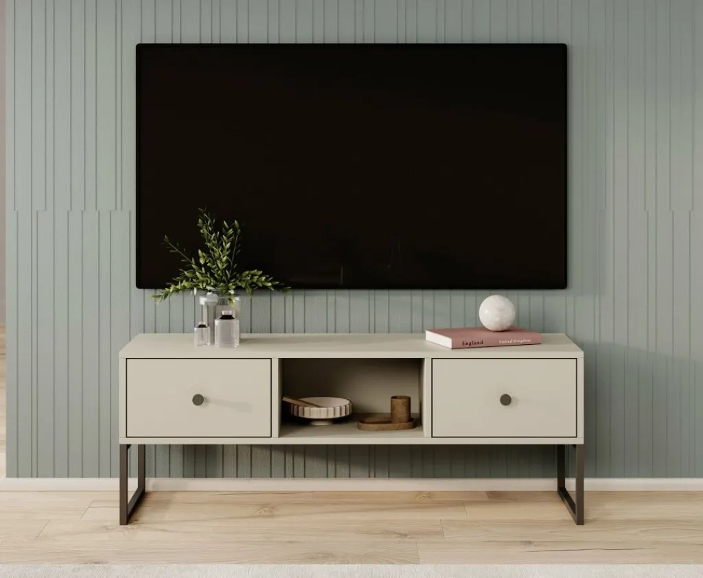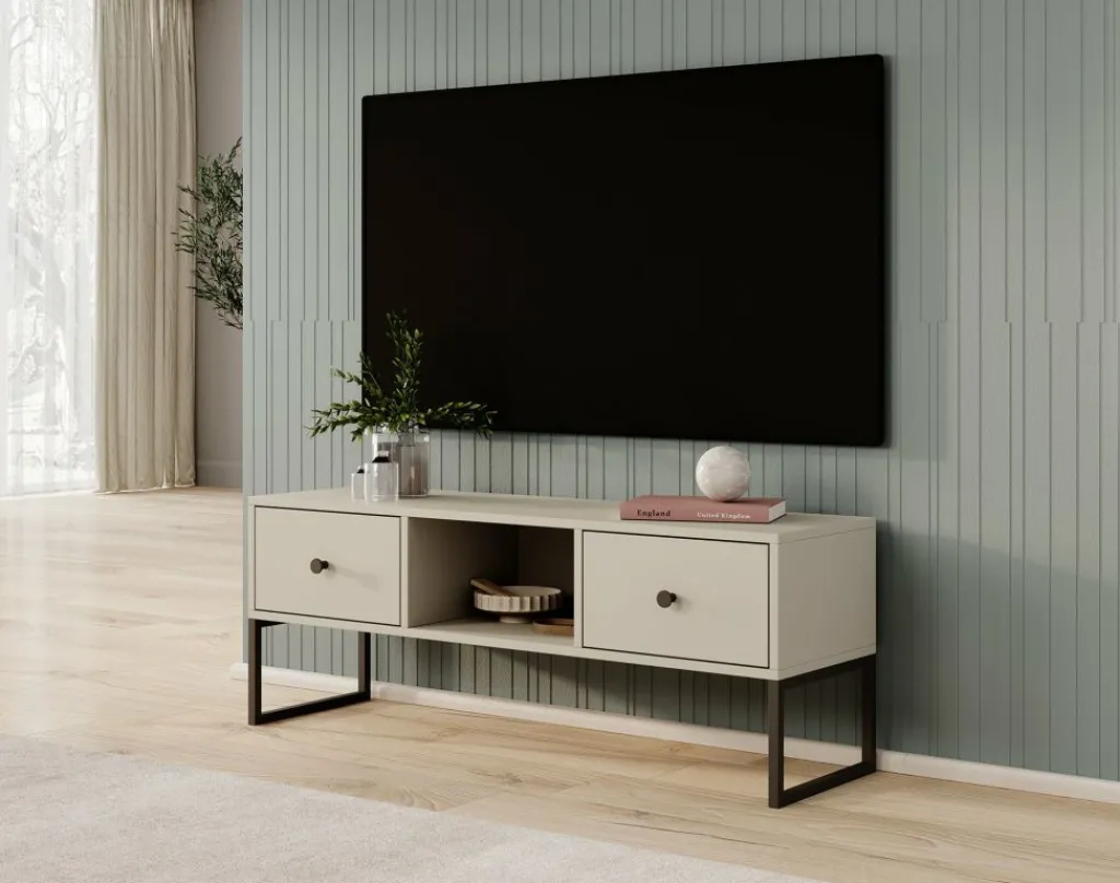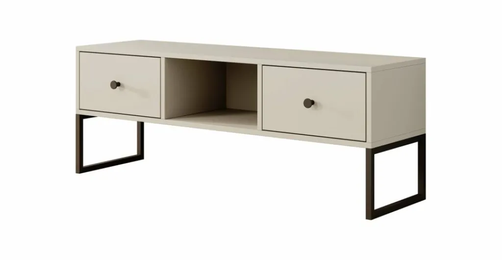 TV-Meubel Lyndall is een opbergkast voor onder de tv in een moderne stijl. De TV-kast is gemaakt in een beige kleur met zwarte poten. Deze poten zijn gemaakt van metaal. De Lyndall beschikt over een open vak en 2 lades die openen met zwarte knoppen. In de achterwand zit een uitsparing om eventuele bedrading weg te kunnen werken.
