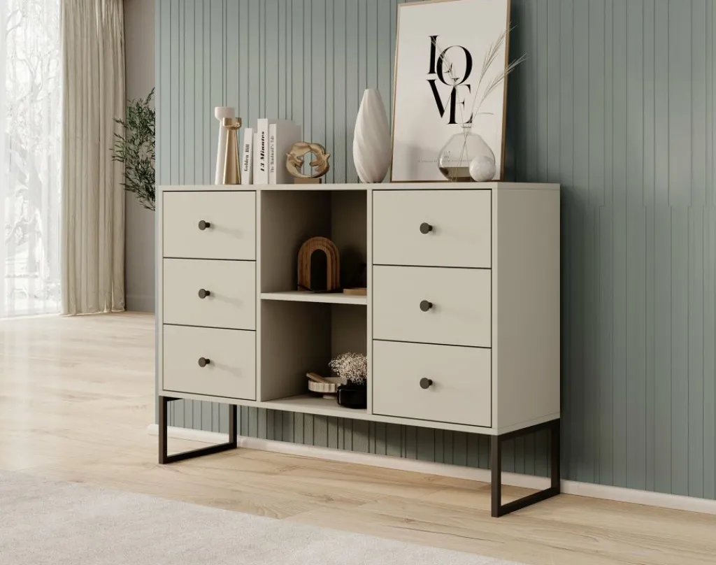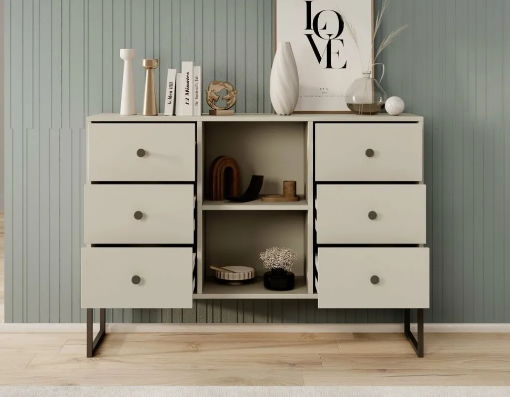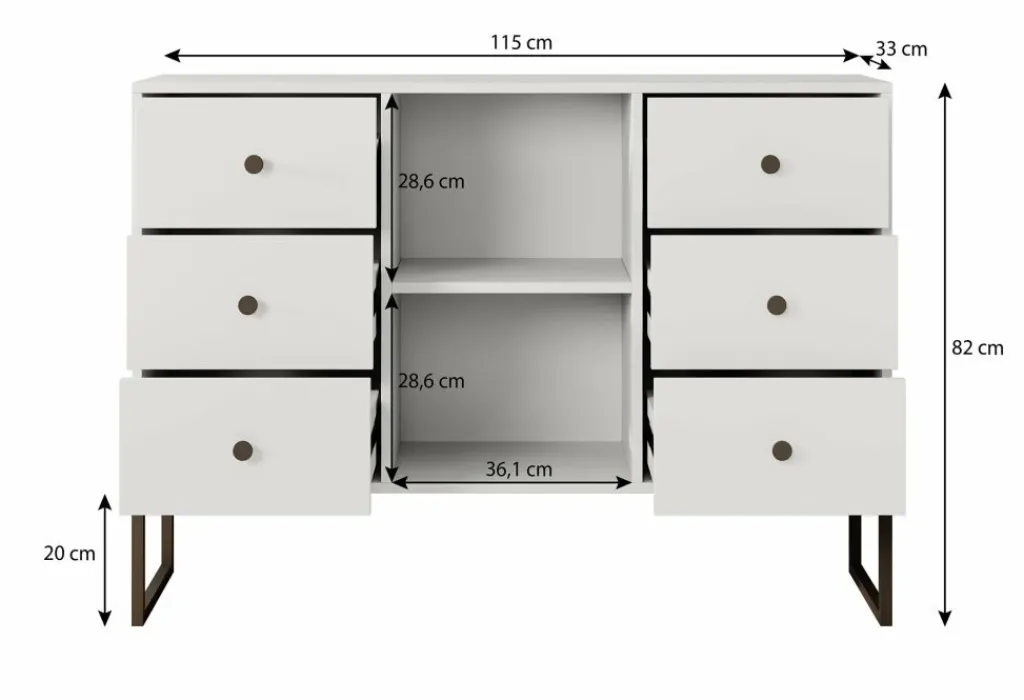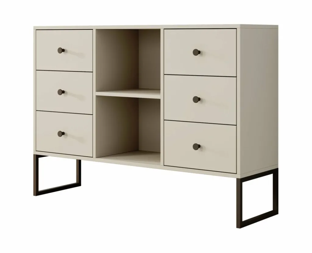 De kast heeft 6 lades welke te openen zijn met zwarte knoppen. In het midden zitten nog 2 open vakken.