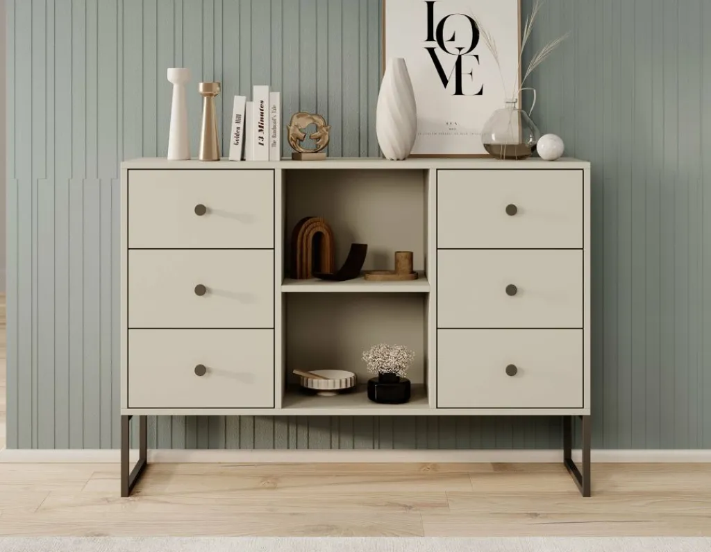 Dressoir Lyndall is een opbergkast in een moderne stijl in beige kleur. Het dressoir staat op zwart metalen poten.