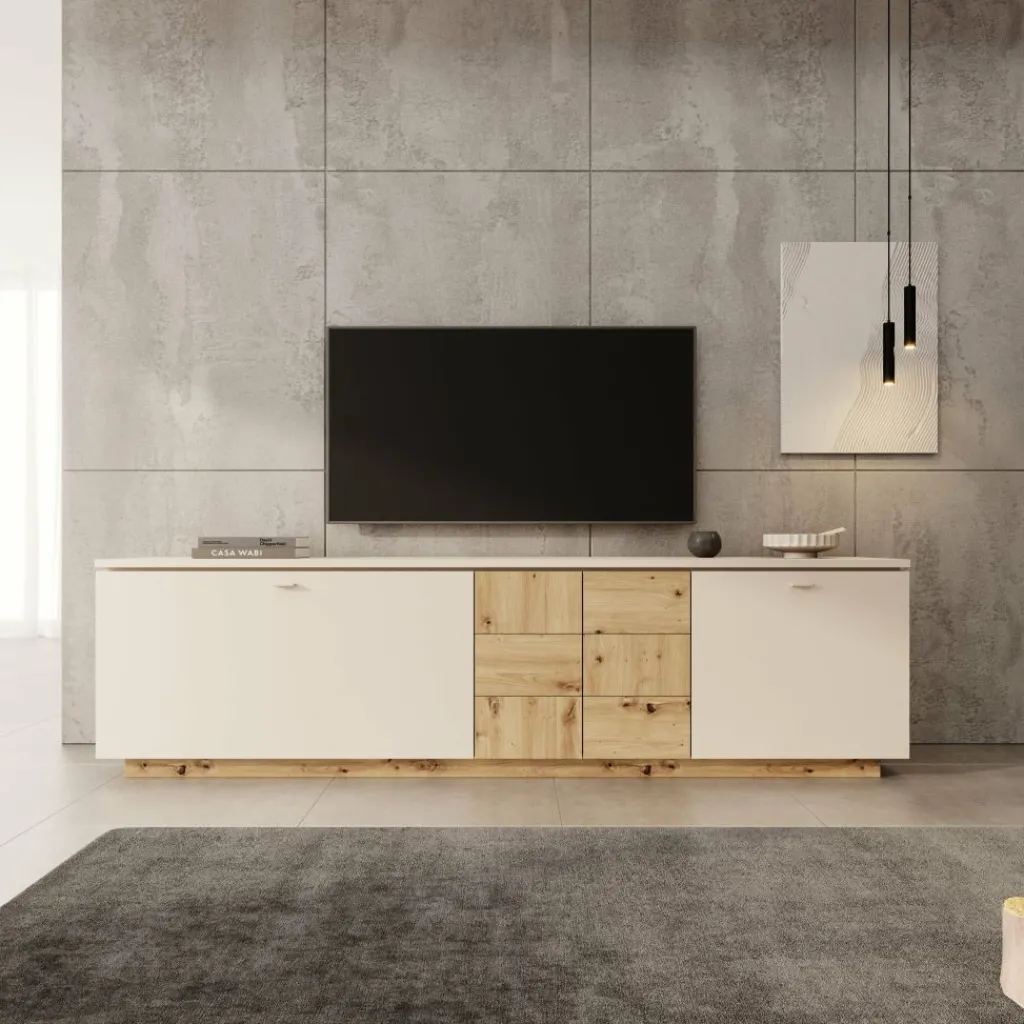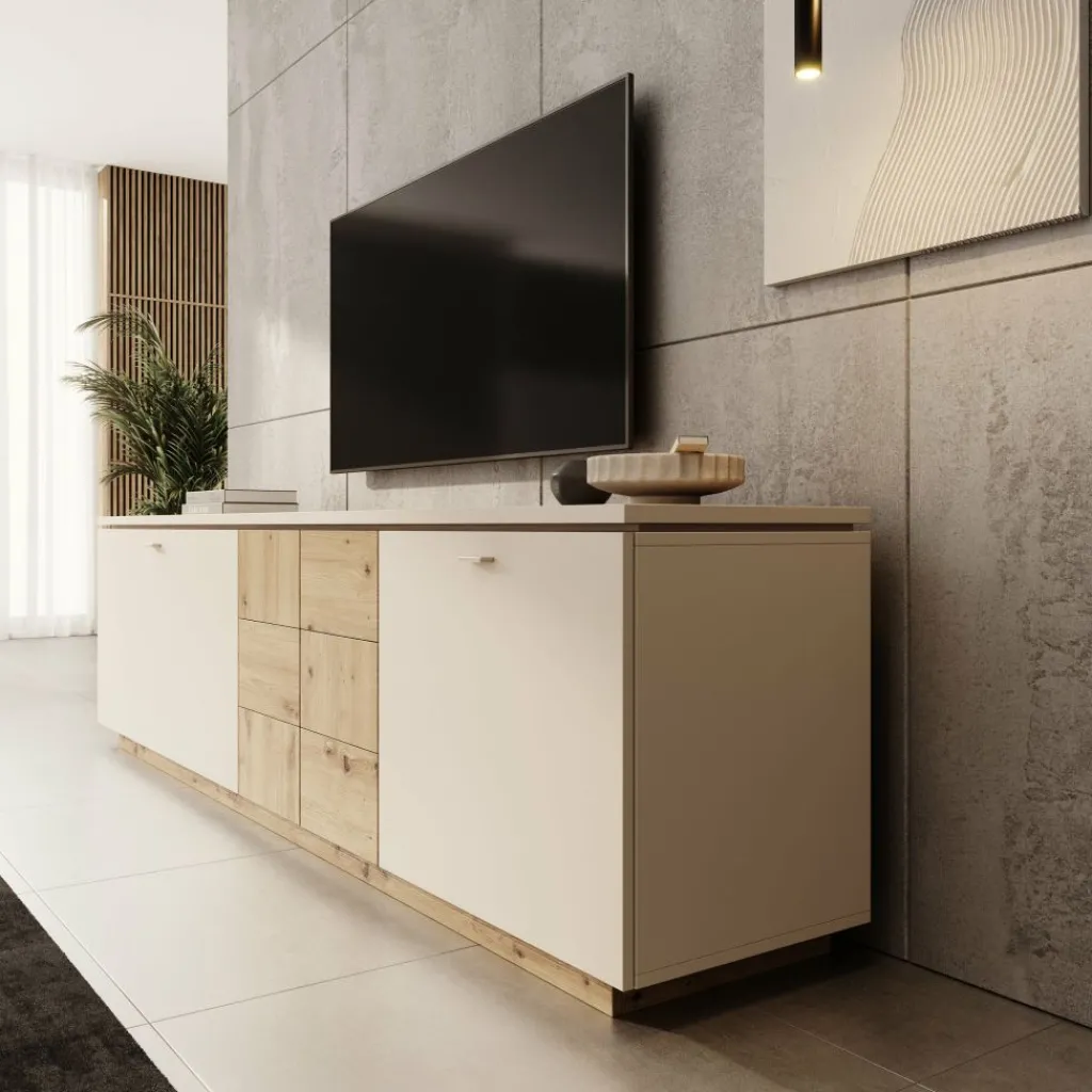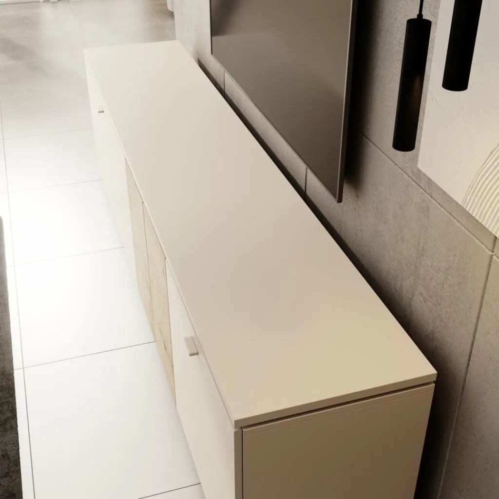 De combinatie van beige fronten met het centrale gedeelte in eikenpatroon geeft het meubel een modern en warm karakter. Dit contrast zorgt voor een opvallend detail zonder dat het meubel te druk oogt, waardoor het goed past in verschillende woonstijlen.