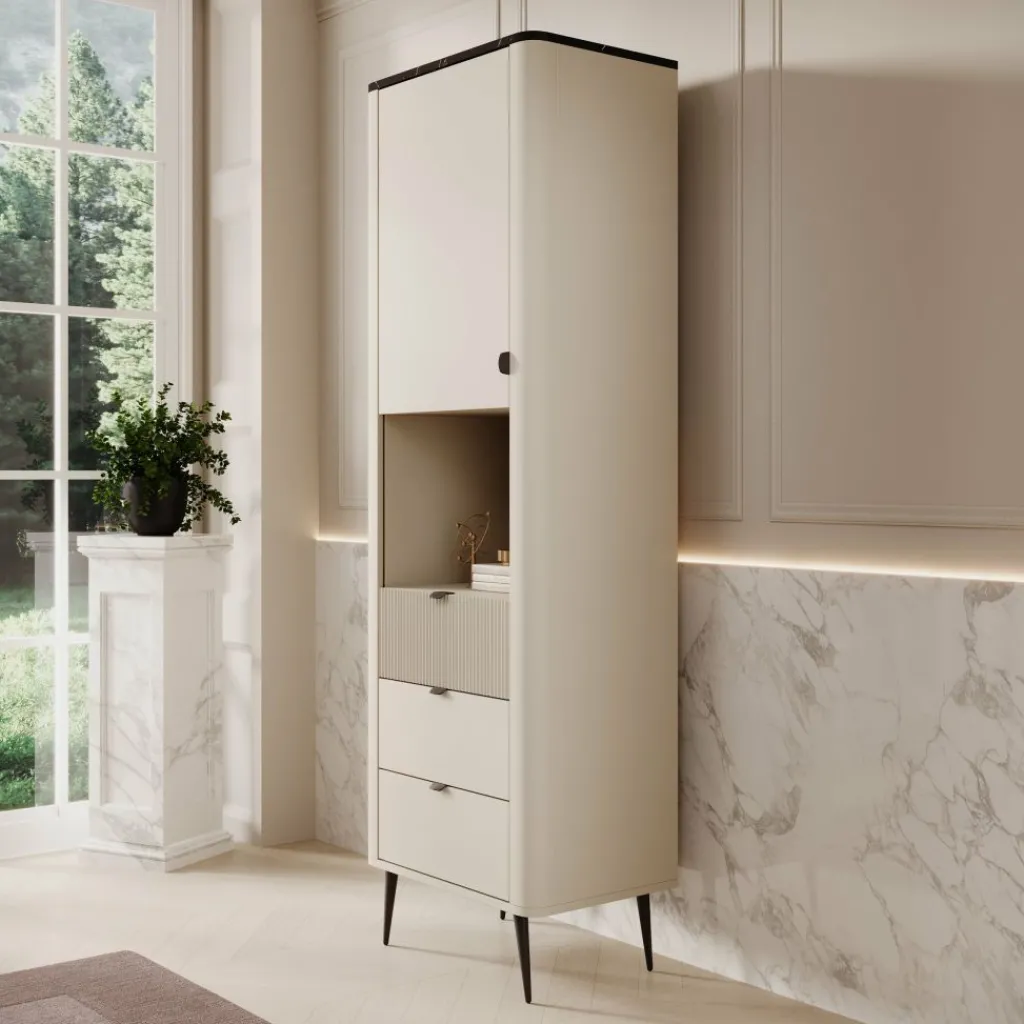 De Mace vitrinekast is een hoge opbergkast met een combinatie van gesloten en open opbergruimte. De kast is uitgevoerd in beige met zwart frame.