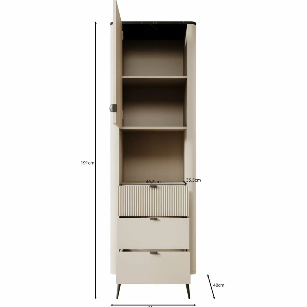 Deze vitrinekast is 60 cm breed, 40 cm diep en 191 cm hoog. Bovenin bevindt zich een scharnierdeur met daarachter twee ruime legplanken. Onder deze vitrine zitten 3 lades en een open vak voor extra opbergruimte.