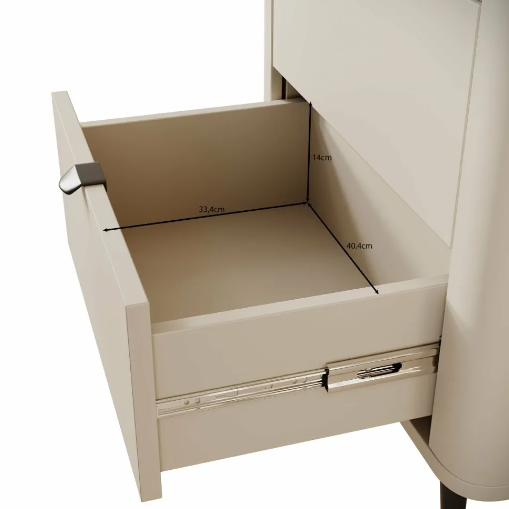 Het bovenblad heeft een zwarte marmerlook met witte adering. Het beige meubel is afgewerkt met een matte coating en voorzien van afgeronde hoeken. De kast staat op slanke metalen poten.