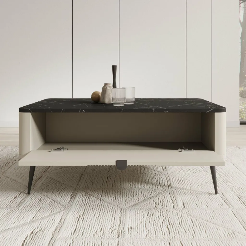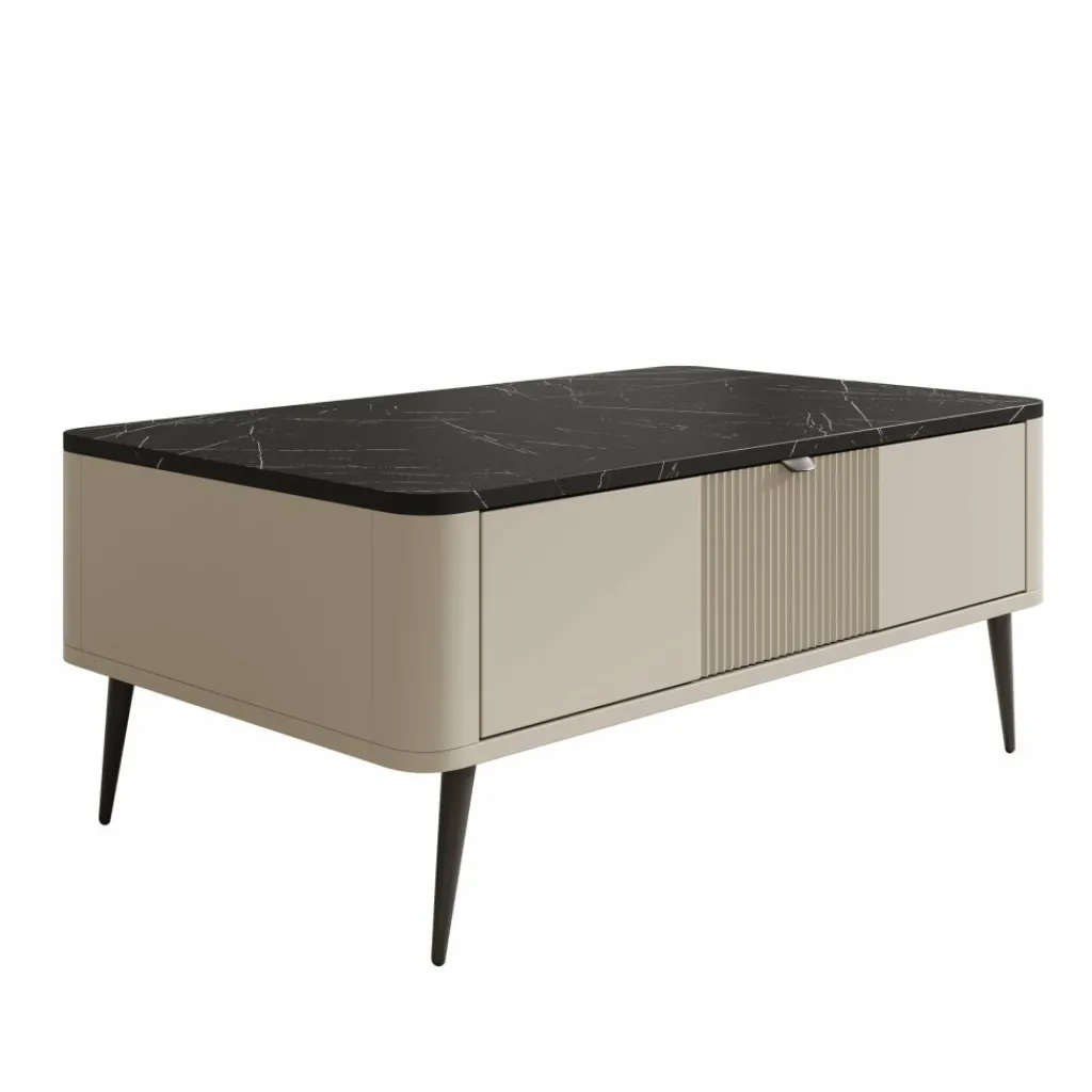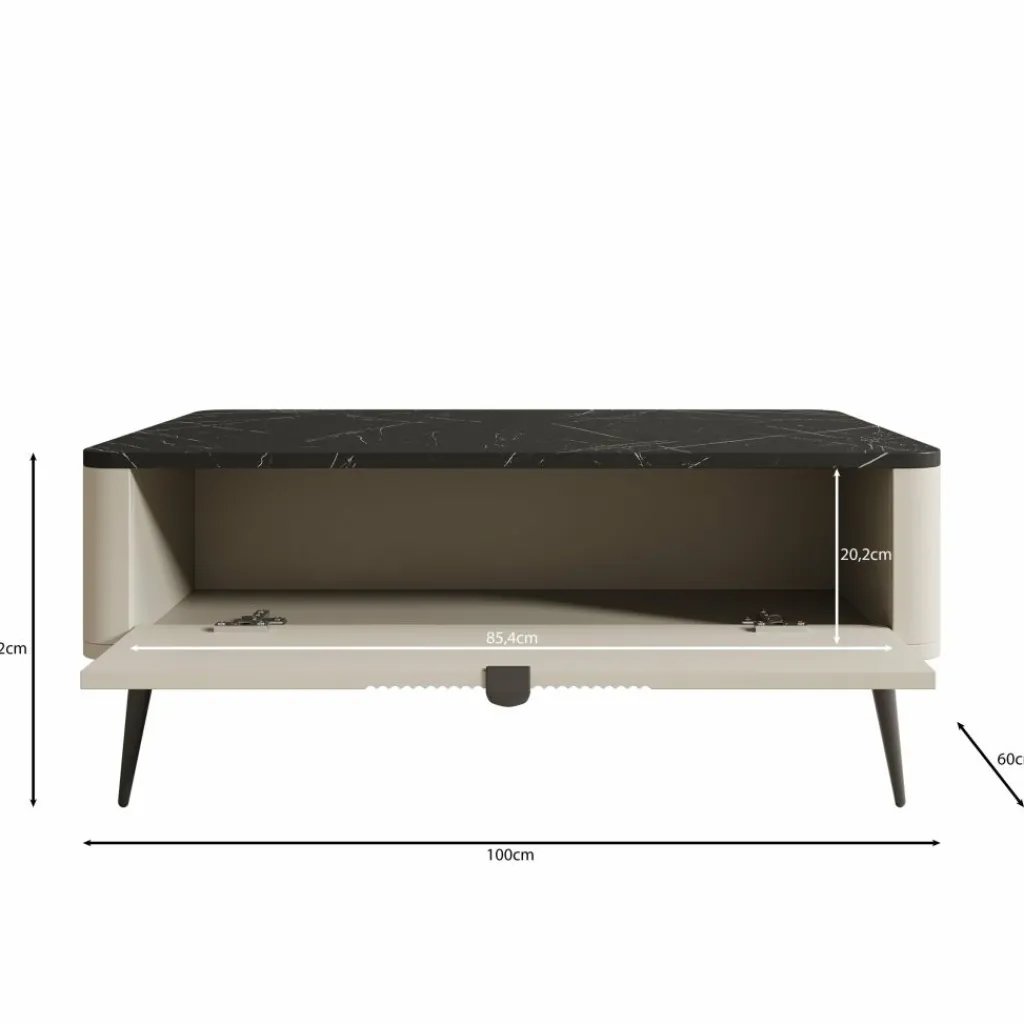 De Mace salontafel combineert functionaliteit met een modern ontwerp. Het beige onderstel met verticale latstructuur, afgeronde hoeken en een zwart bovenblad met marmerlook geven de tafel een rustige en stijlvolle uitstraling.