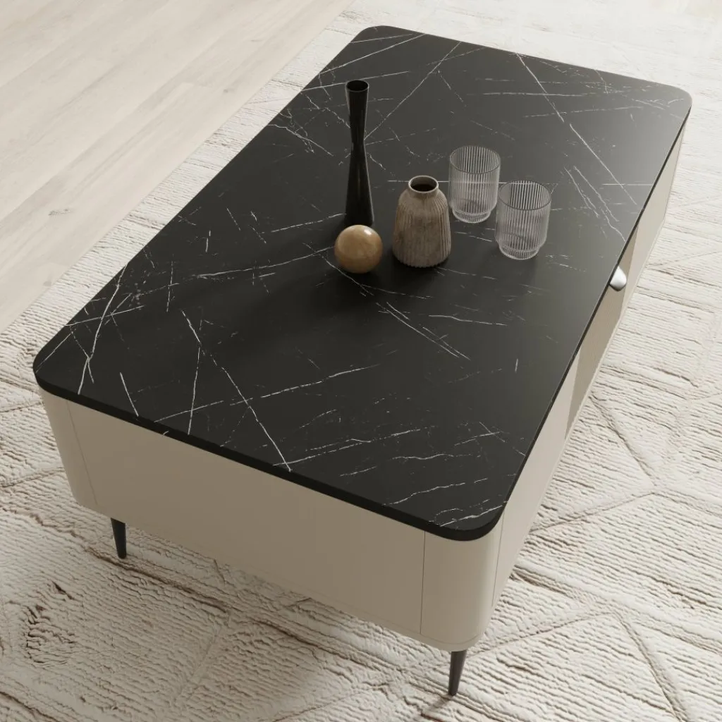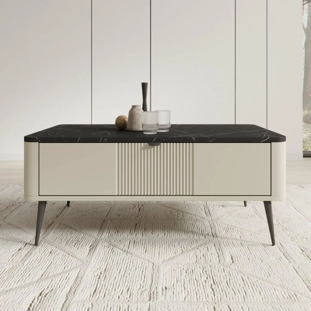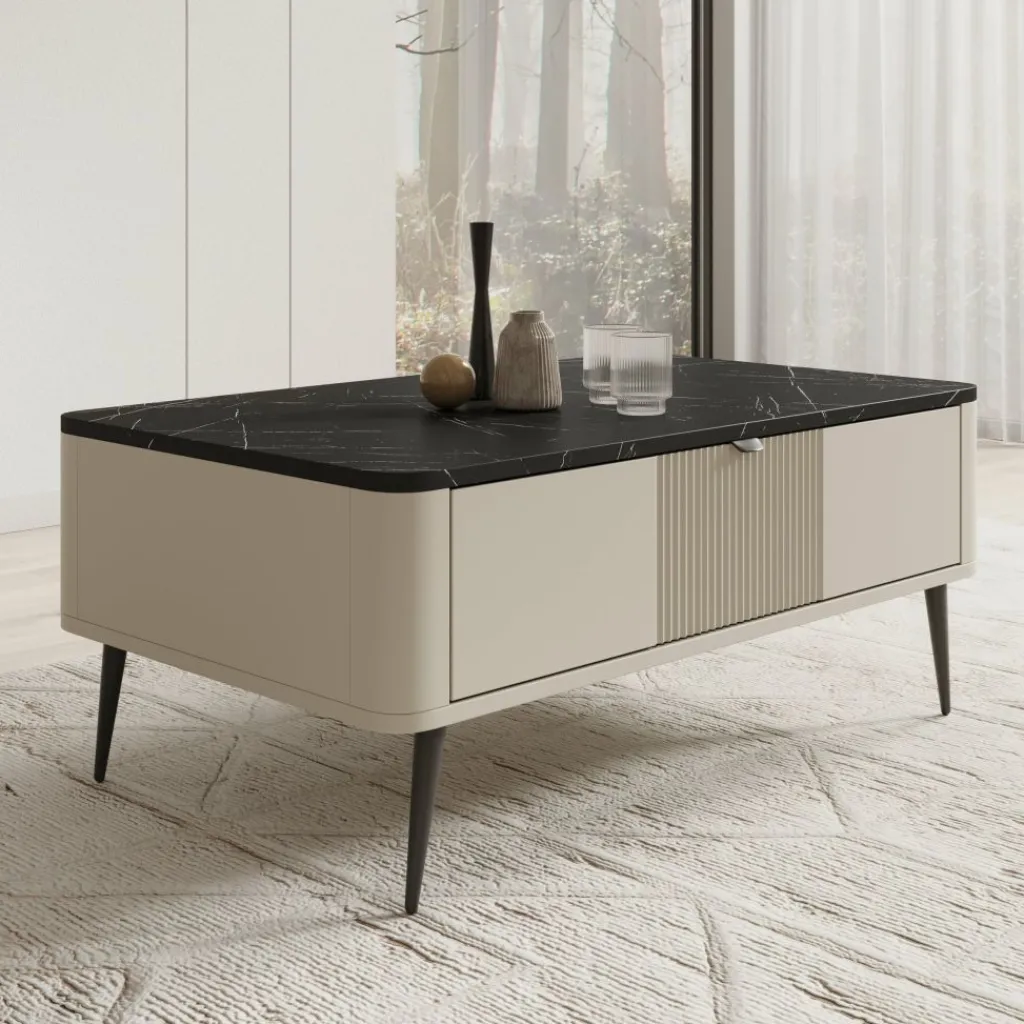 De Mace salontafel combineert functionaliteit met een modern ontwerp. Het beige onderstel met verticale latstructuur, afgeronde hoeken en een zwart bovenblad met marmerlook geven de tafel een rustige en stijlvolle uitstraling.