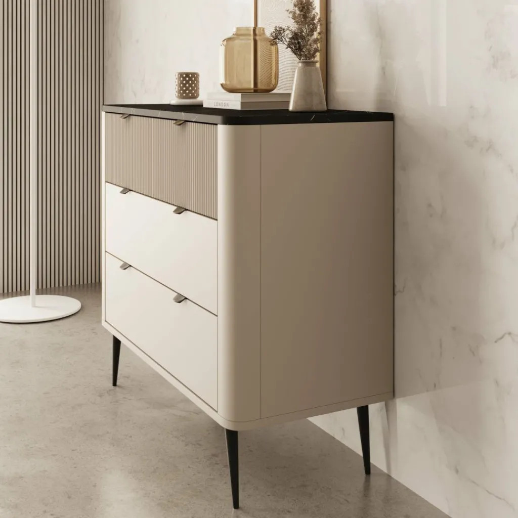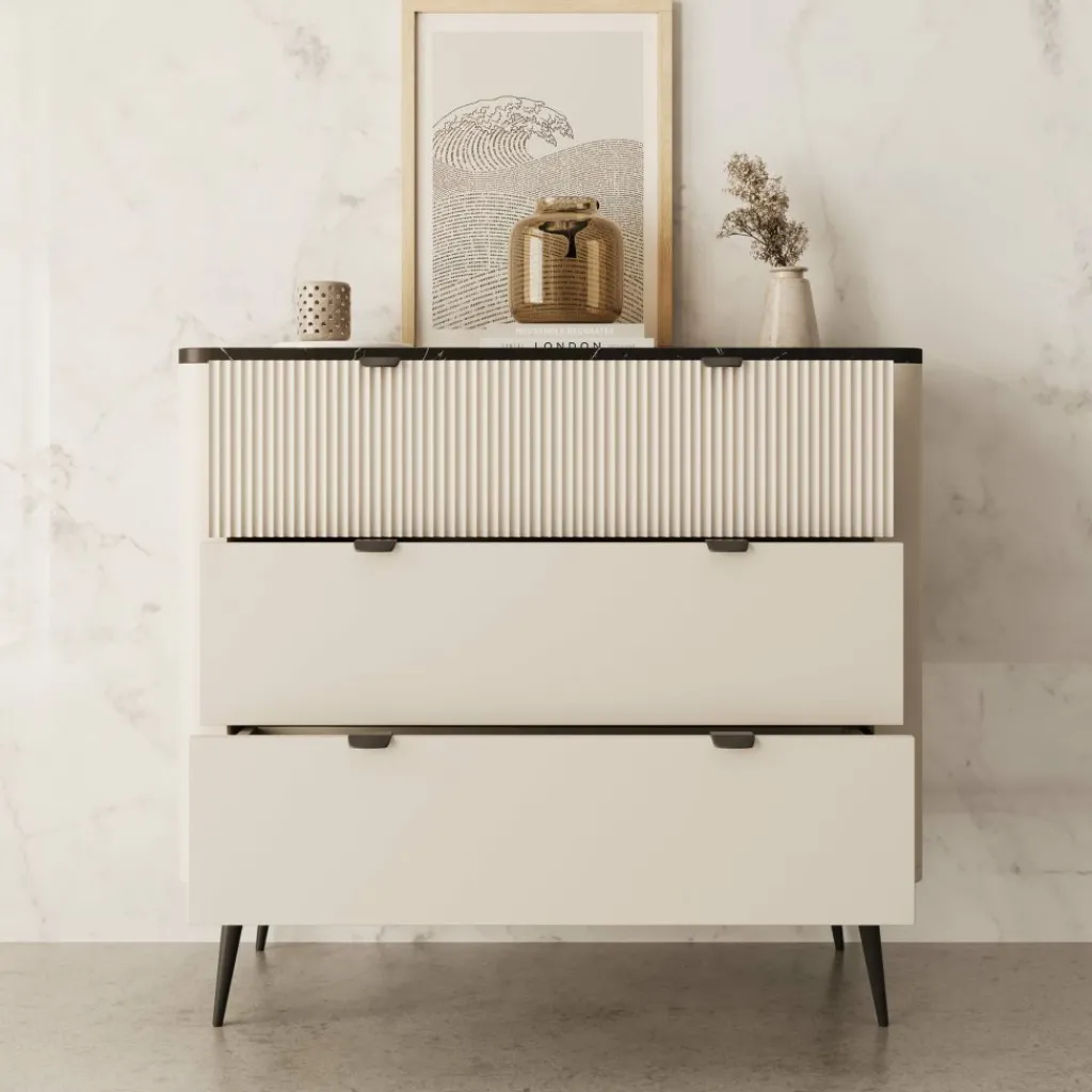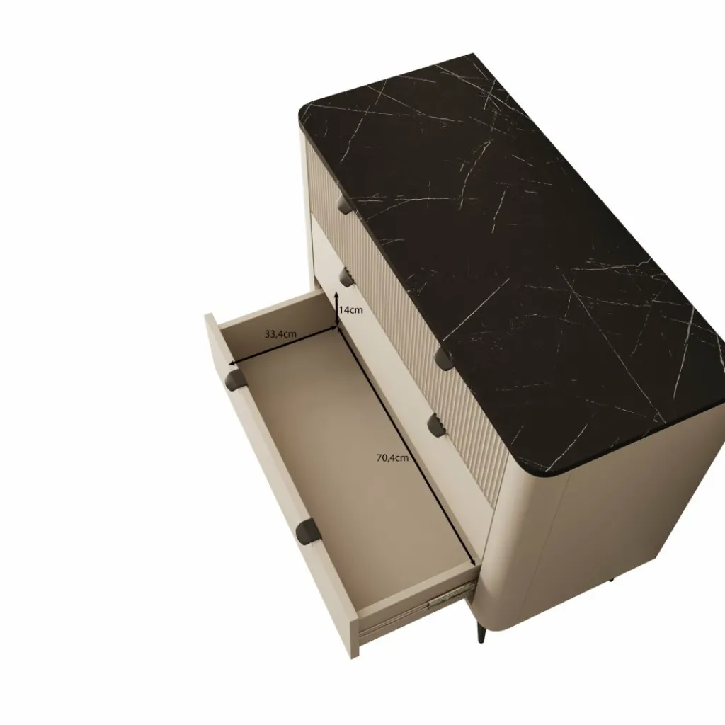 Ladekast Mace is een verfijnd en modern vormgegeven meubelstuk, uitgevoerd in beige met een opvallend zwart marmerlook blad. De afgeronde hoeken en verticale groeven op de bovenste lade geven deze kast een elegante en hotel-chique uitstraling. De zwarte handgrepen en slanke, metalen pootjes zorgen voor een strak geheel.