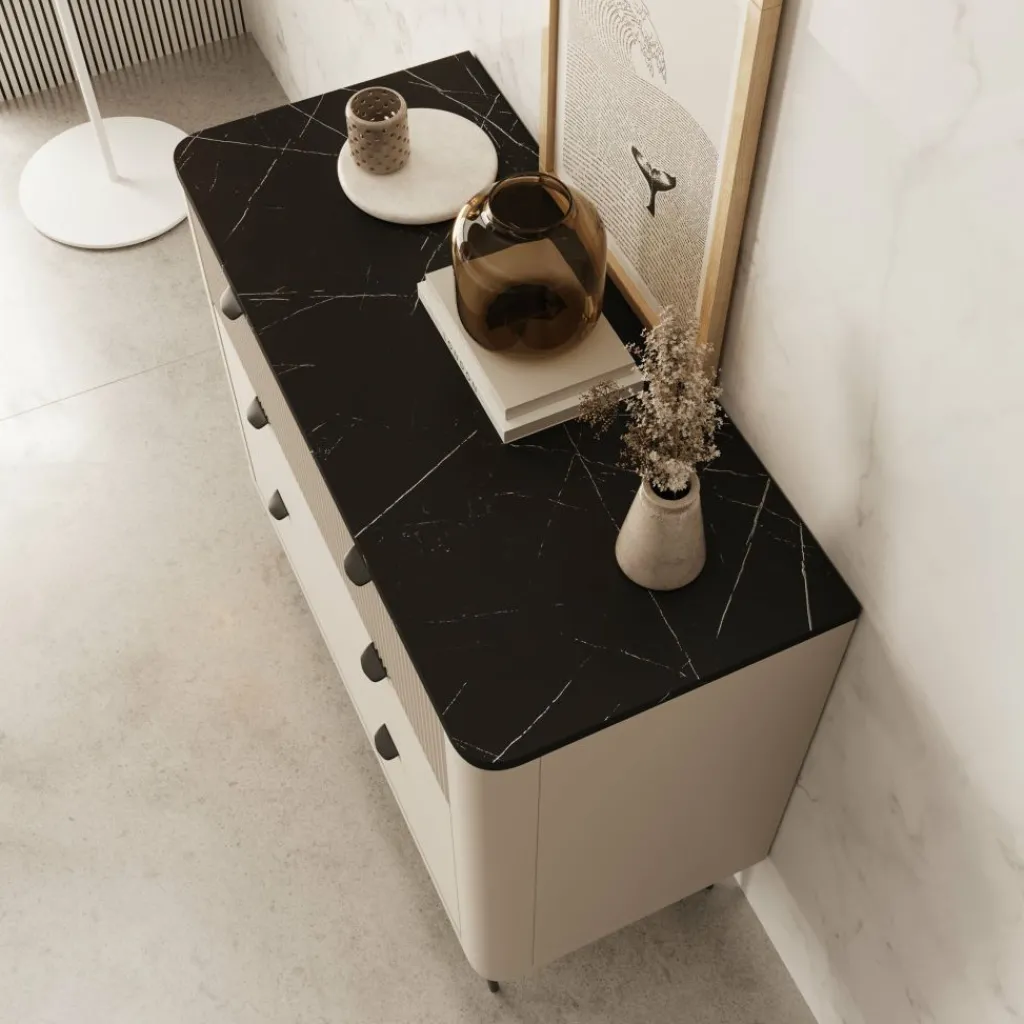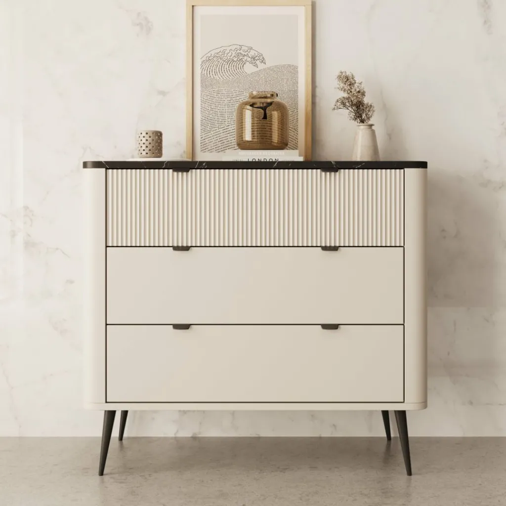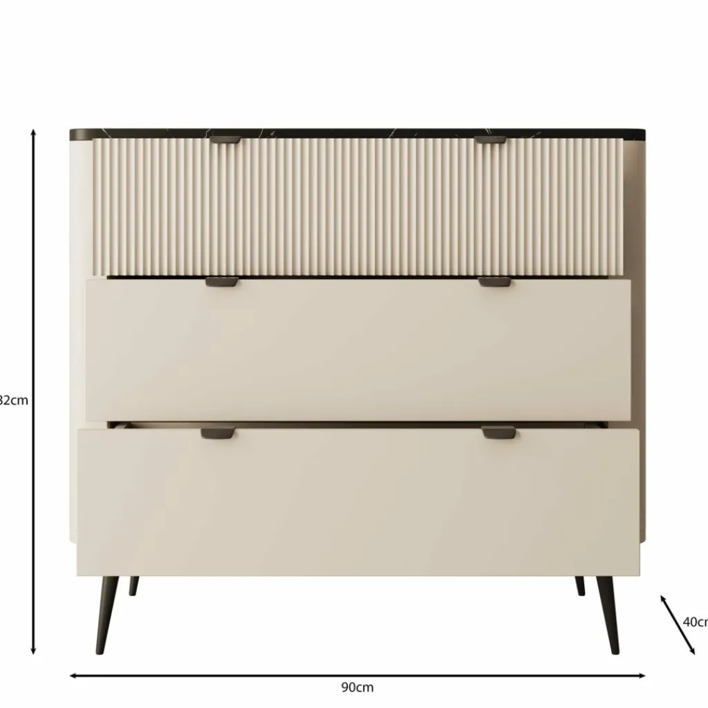 Ladekast Mace is een verfijnd en modern vormgegeven meubelstuk, uitgevoerd in beige met een opvallend zwart marmerlook blad. De afgeronde hoeken en verticale groeven op de bovenste lade geven deze kast een elegante en hotel-chique uitstraling. De zwarte handgrepen en slanke, metalen pootjes zorgen voor een strak geheel.