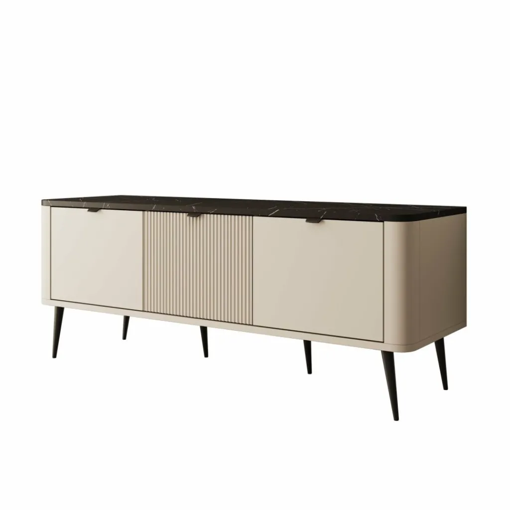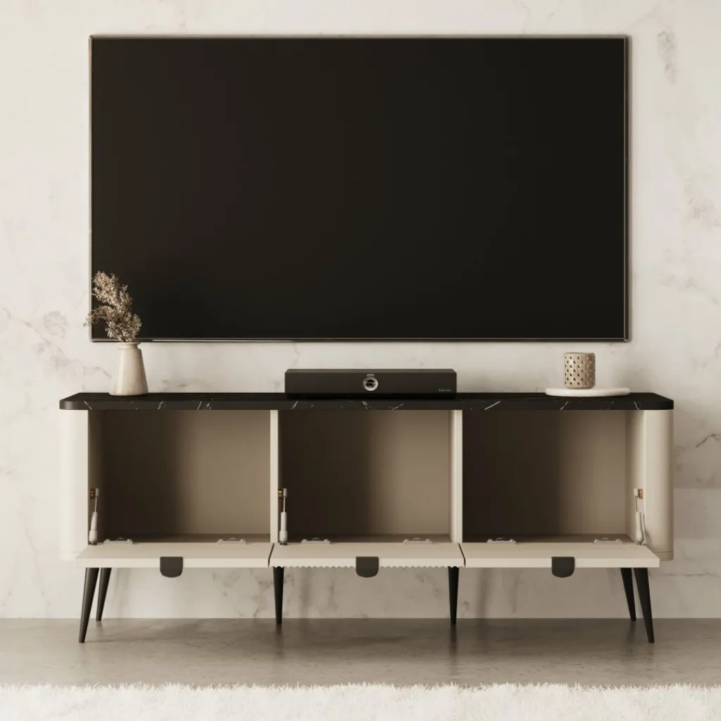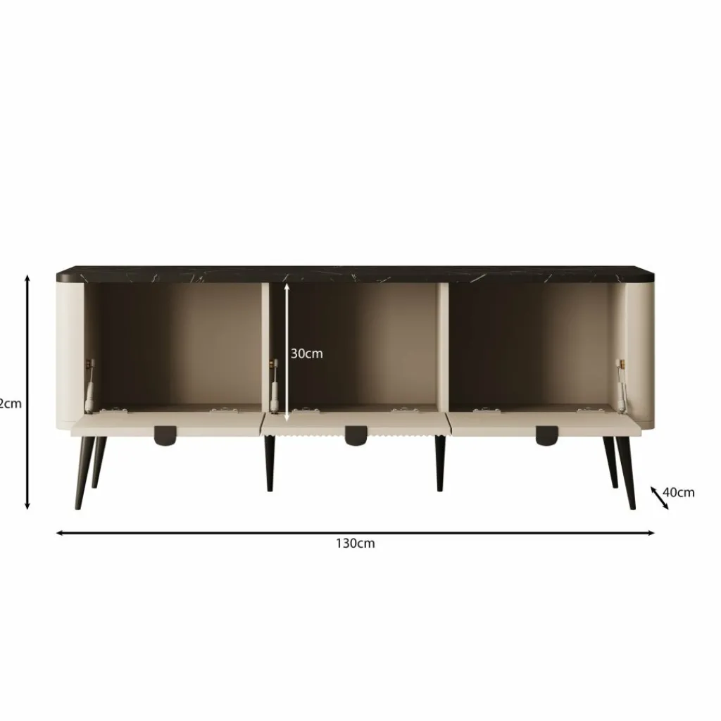 TV-meubel Mace van 130 cm breed is uitgevoerd in beige met een zwart marmerlook blad. De drie klepdeuren geven toegang tot ruime opbergvakken van 30 cm hoog – perfect voor apparatuur, kabels of andere spullen die je uit het zicht wilt houden.