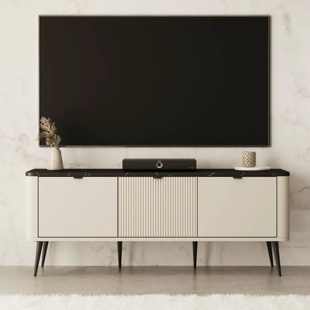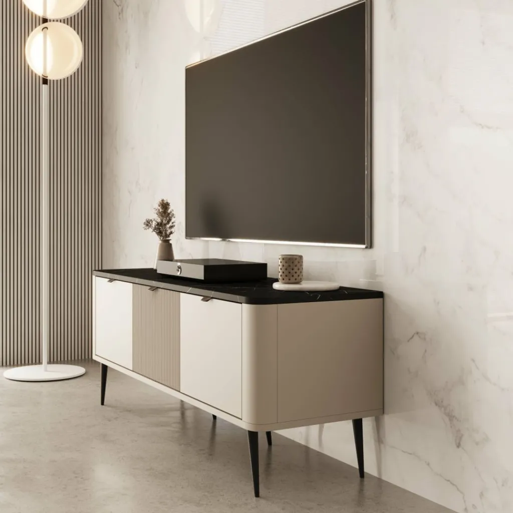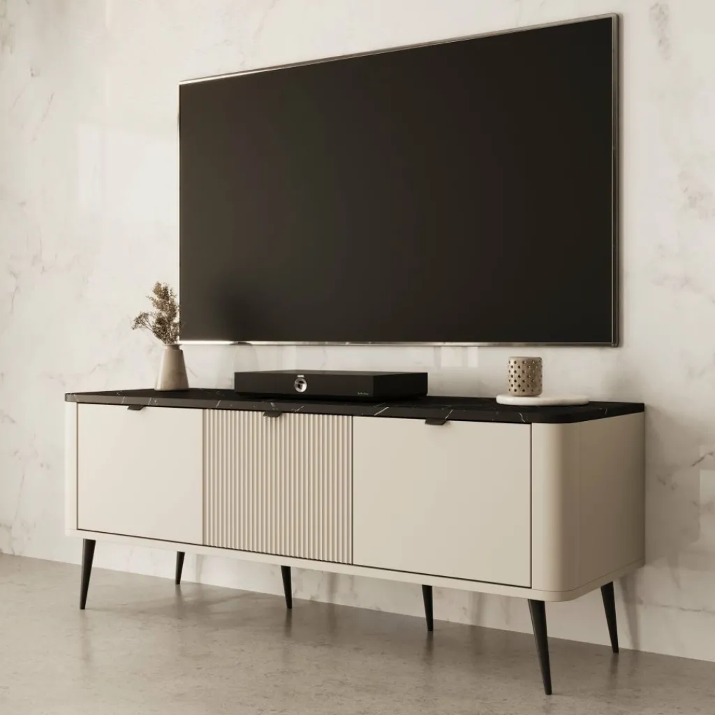 TV-meubel Mace van 130 cm breed is uitgevoerd in beige met een zwart marmerlook blad. De drie klepdeuren geven toegang tot ruime opbergvakken van 30 cm hoog – perfect voor apparatuur, kabels of andere spullen die je uit het zicht wilt houden.