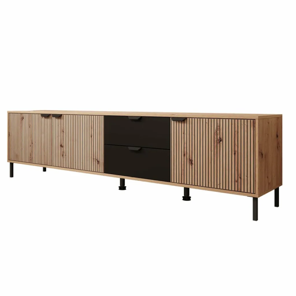 Het tv-meubel Malaika heeft een moderne uitstraling dankzij de combinatie van eikenlook en zwarte fronten. De deuren hebben een verticale latstructuur die onderdeel is van het oppervlak zelf, dus geen losse latjes en geen ingefreesde groeven. Dit zorgt voor een rustige en egale afwerking met een strak lijnenspel.