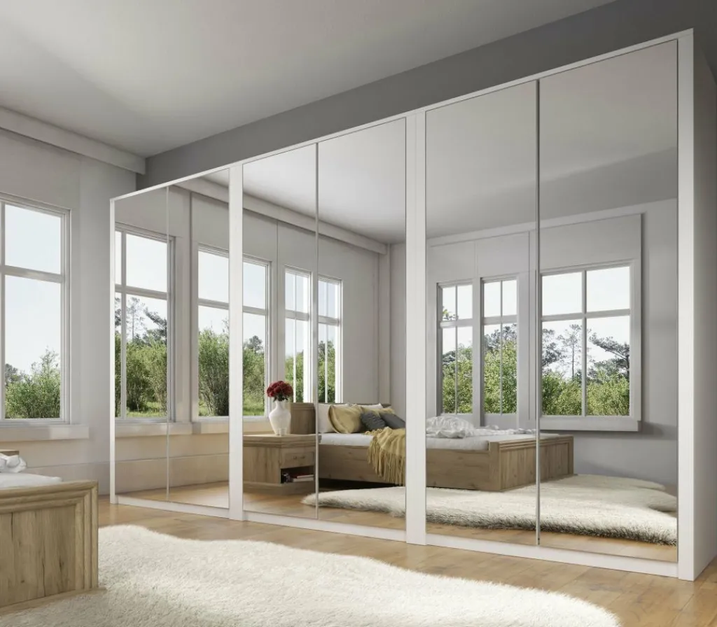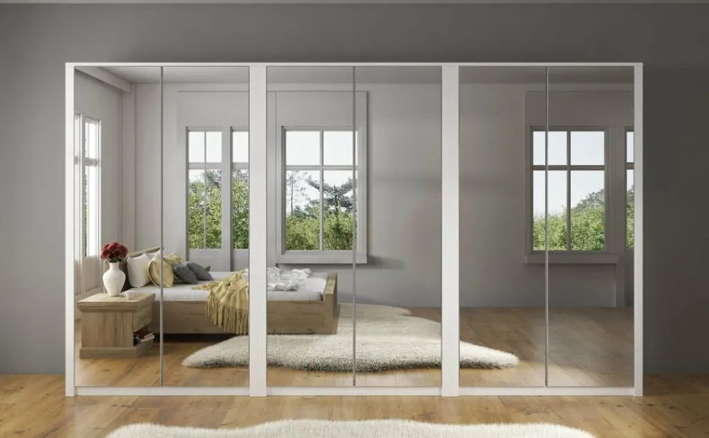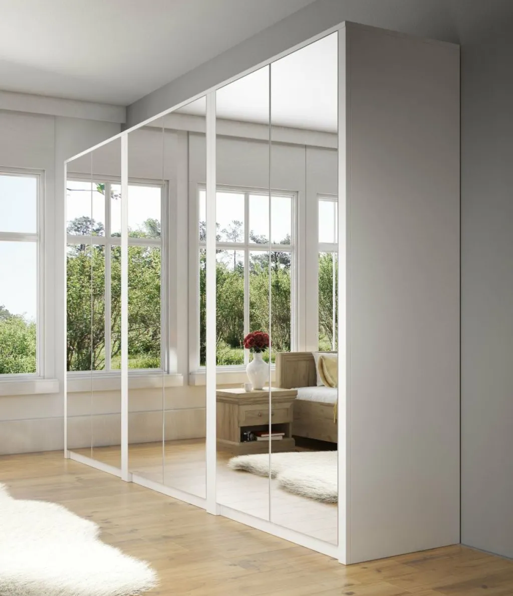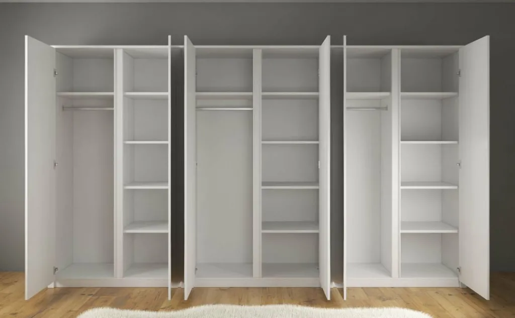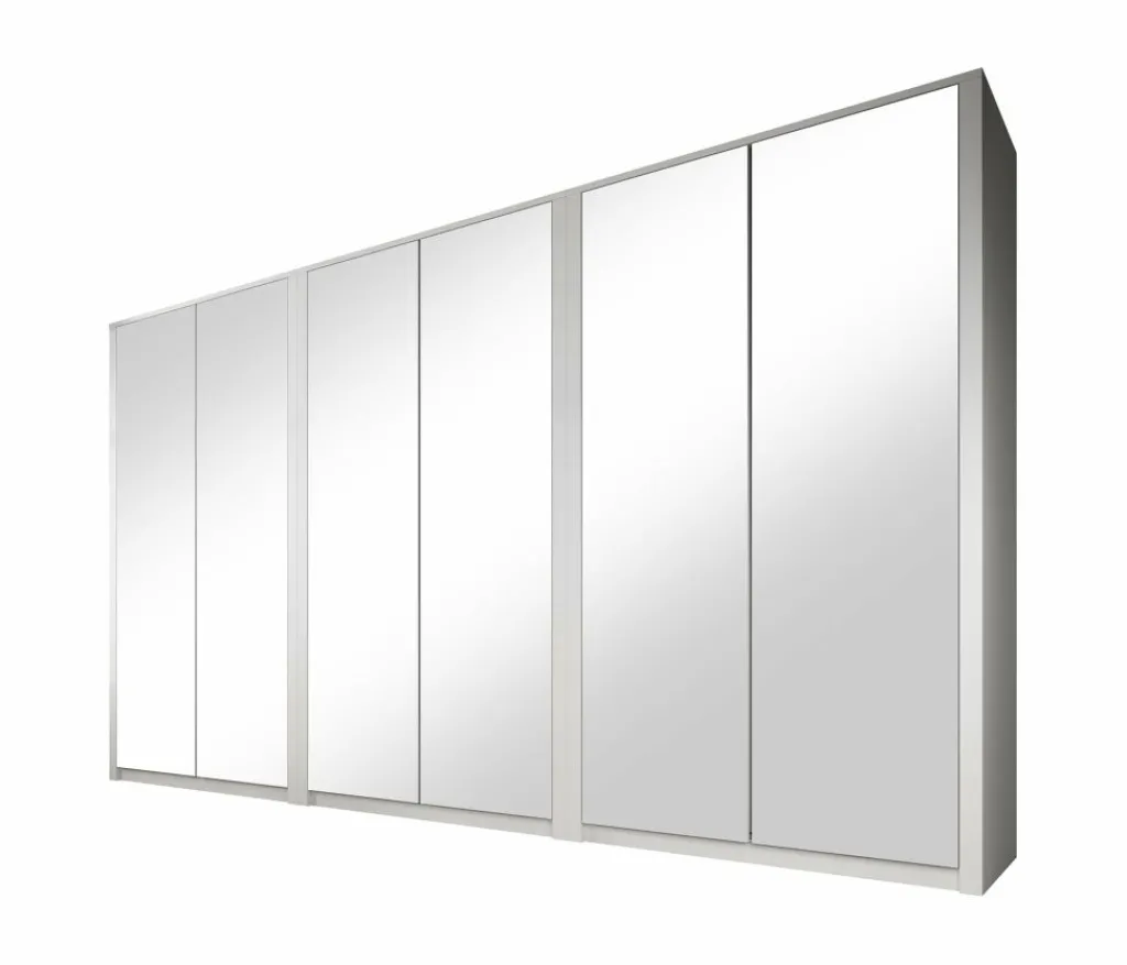 Garderobekast Malibu is een praktische kast uitgevoerd in witte kleur. De Malibu is een set van 3 kasten. De kledingkast beschikt over 6 openslaande deuren. Op alle zes de deuren zijn spiegels geplaatst. Het binnenwerk bestaat per kast uit aan de rechterzijde vijf open schappen. Aan de linkerkant bevindt zich een metalen stang om kleding aan op te hangen. Daarboven zit nog een open schap.
