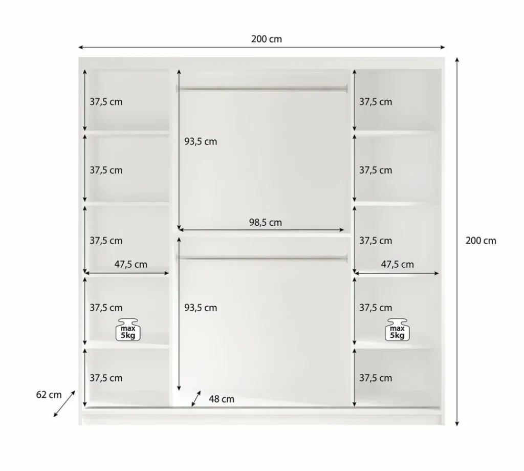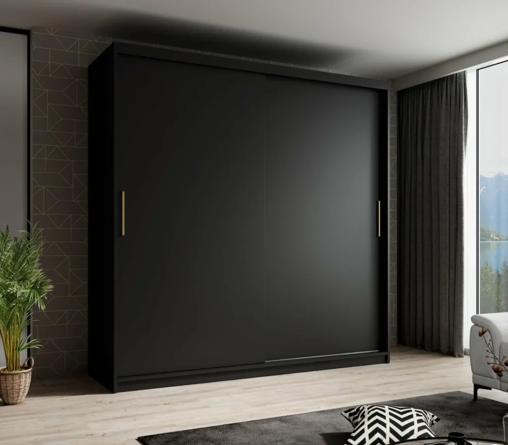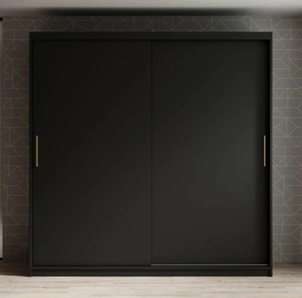 Garderobekast Mandalin is een moderne kast uitgevoerd in mat zwarte kleur. De kledingkast heeft twee schuifdeuren met daarachter veel opbergruimte, namelijk 10 opbergvakken en 2 kledingroedes om kleren aan op te hangen. De deuren zijn te openen middels goudkleurige handgrepen.