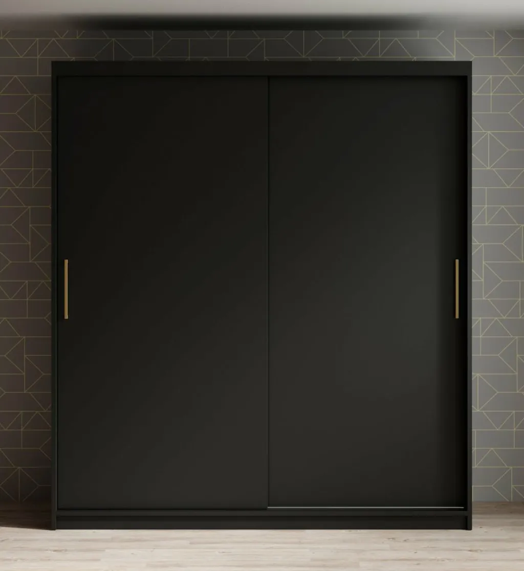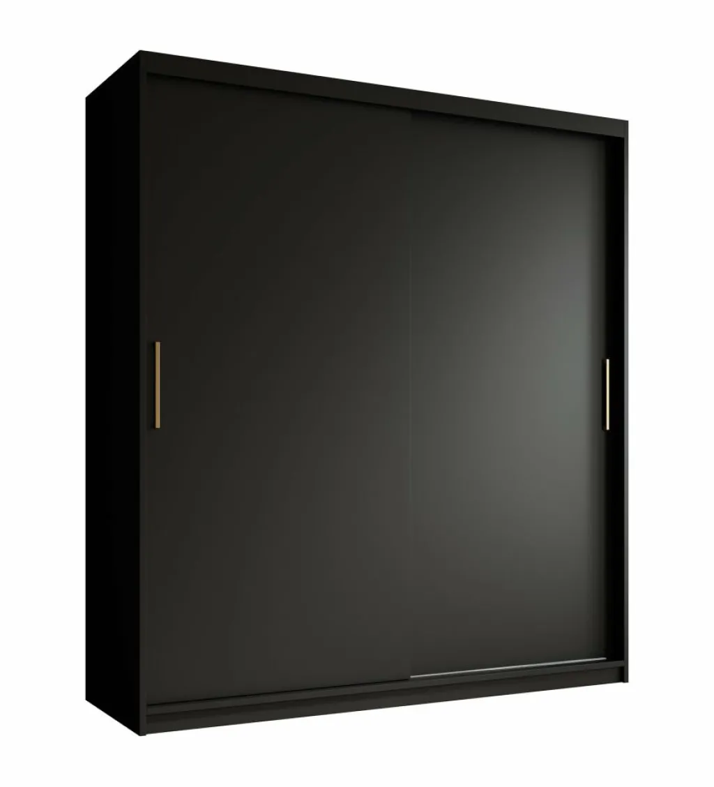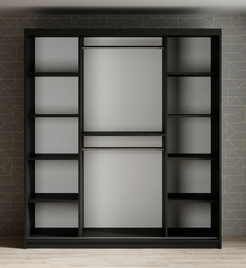 Garderobekast Mandalin is een moderne kast uitgevoerd in mat zwarte kleur. De kledingkast heeft twee schuifdeuren met daarachter veel opbergruimte, namelijk 10 opbergvakken en 2 kledingroedes om kleren aan op te hangen. De deuren zijn te openen middels goudkleurige handgrepen.