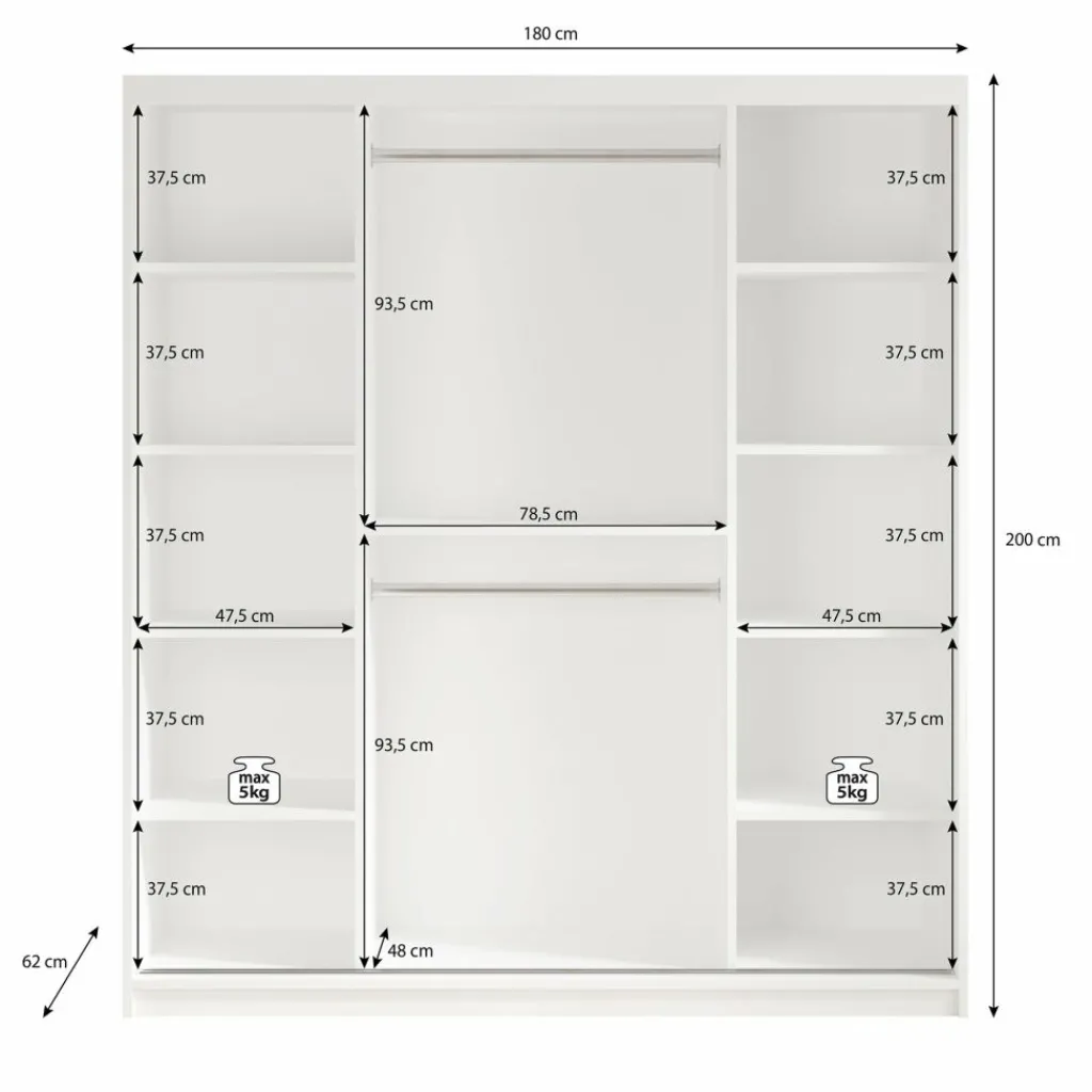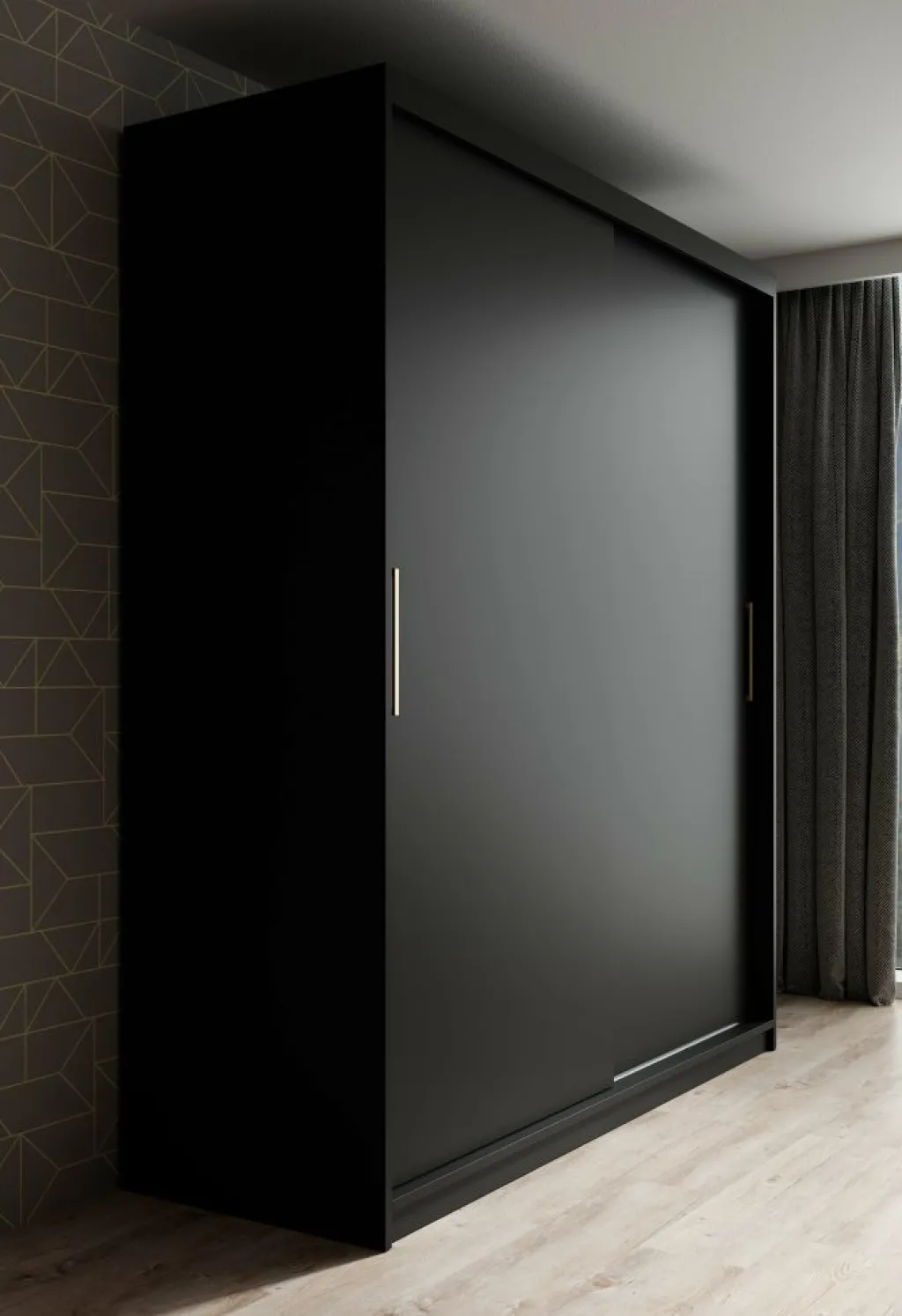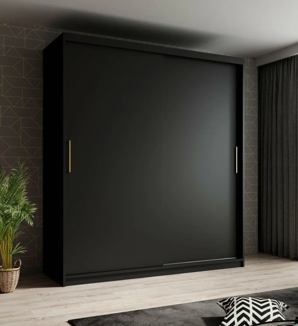Garderobekast Mandalin is een moderne kast uitgevoerd in mat zwarte kleur. De kledingkast heeft twee schuifdeuren met daarachter veel opbergruimte, namelijk 10 opbergvakken en 2 kledingroedes om kleren aan op te hangen. De deuren zijn te openen middels goudkleurige handgrepen.